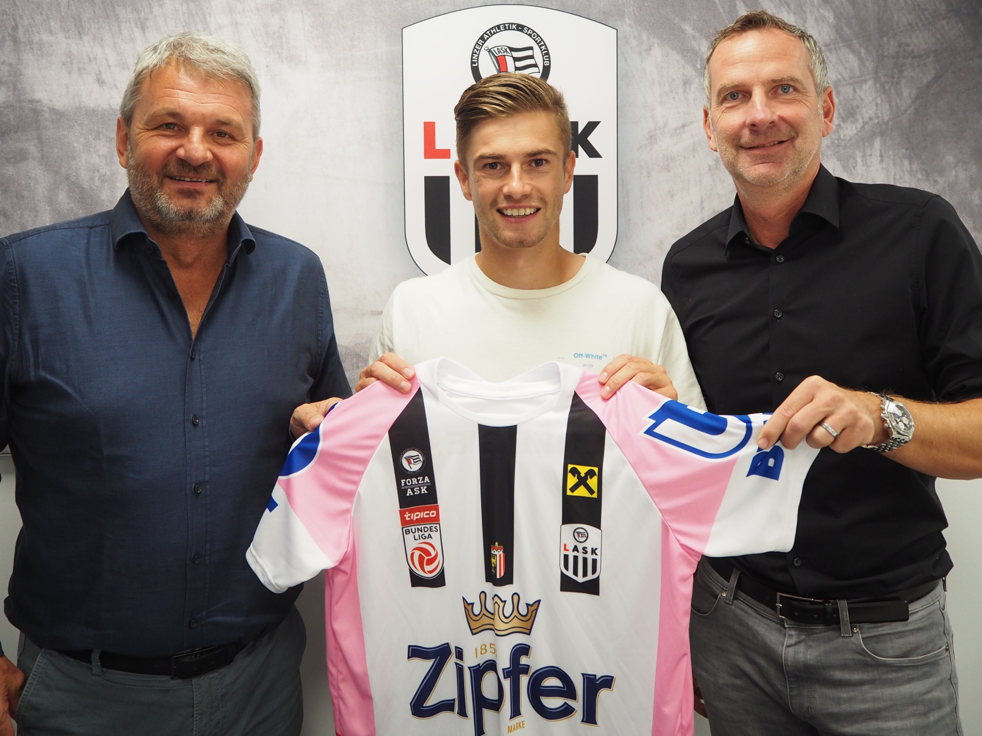LASK-Neuzugang Andreas Gruber mit Vizeprüsident Jürgen Werner und Dominik Thalhammer.