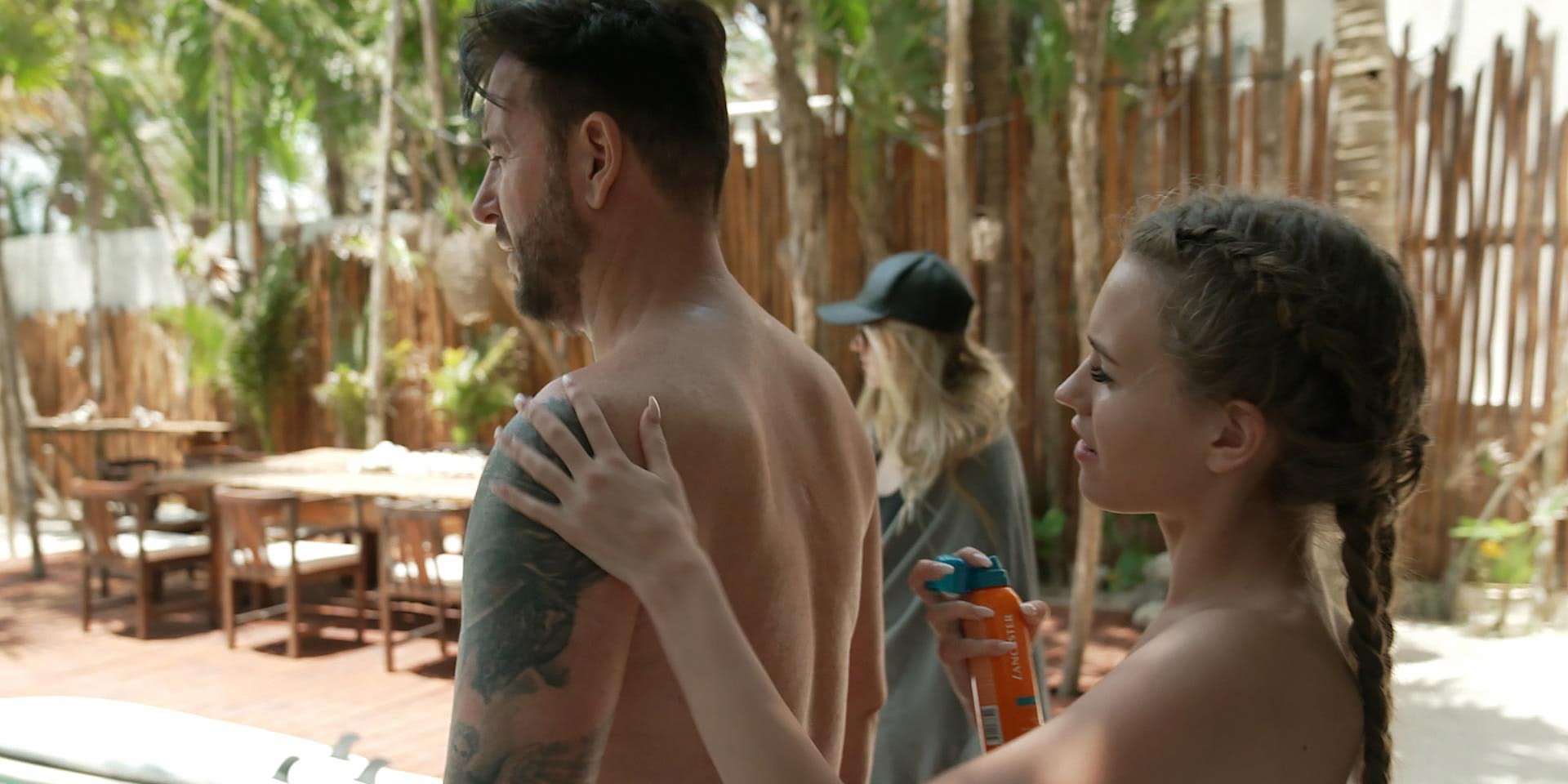 Damit der Wendler keinen Sonnenbrand kriegt, sprüht ihn seine Laura mit Sonnencreme ein.