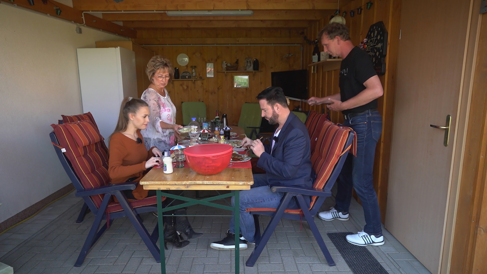 Grillerei bei den Schwiegereltern: Der Wendler greift zu, auch wenn er über seinen Bauch jammert.