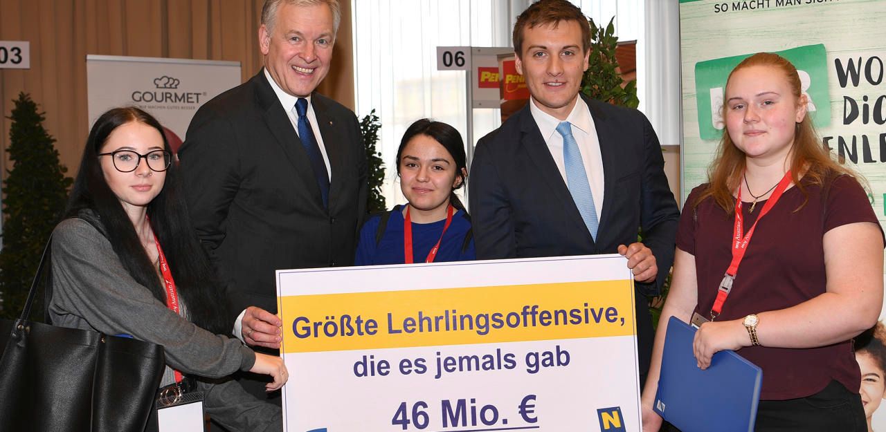 Nadja Hirscher, Landesrat Martin Eichtinger, Edanur Akcan, AMS NÖ-Chef Sven Hergovich und Elisabeth Skok auf der Jobmesse am Flughafen Schwechat.