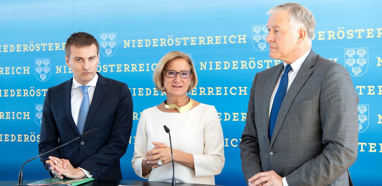 Landeshauptfrau Johanna Mikl-Leitner mit Landesrat Martin Eichtinger (r.) und AMS NÖ-Geschäftsführer Sven Hergovich (l.)