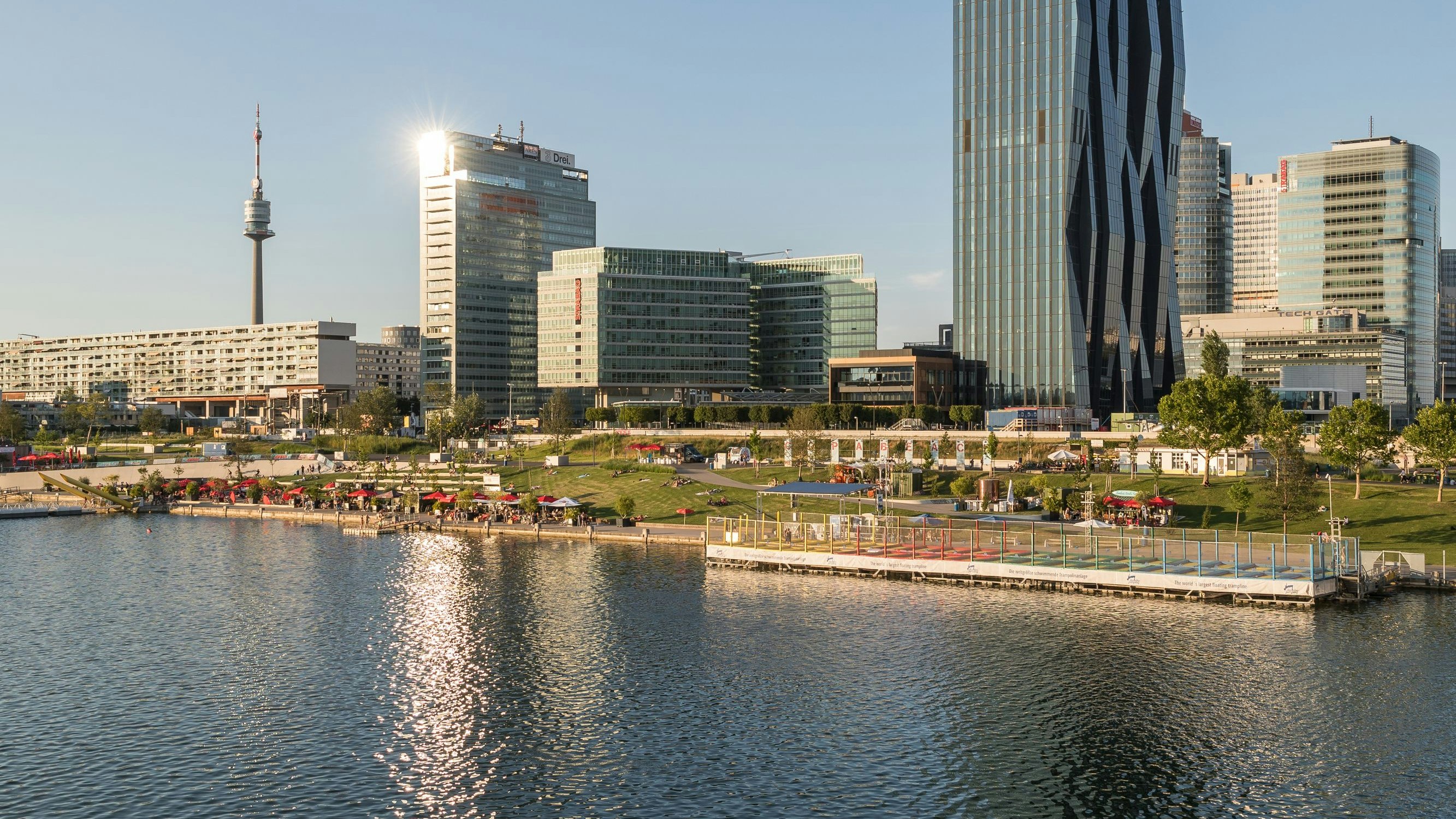 Blick auf die Neue Donau, hinten die Gebäude der Donau City mit dem markanten DC-Tower.