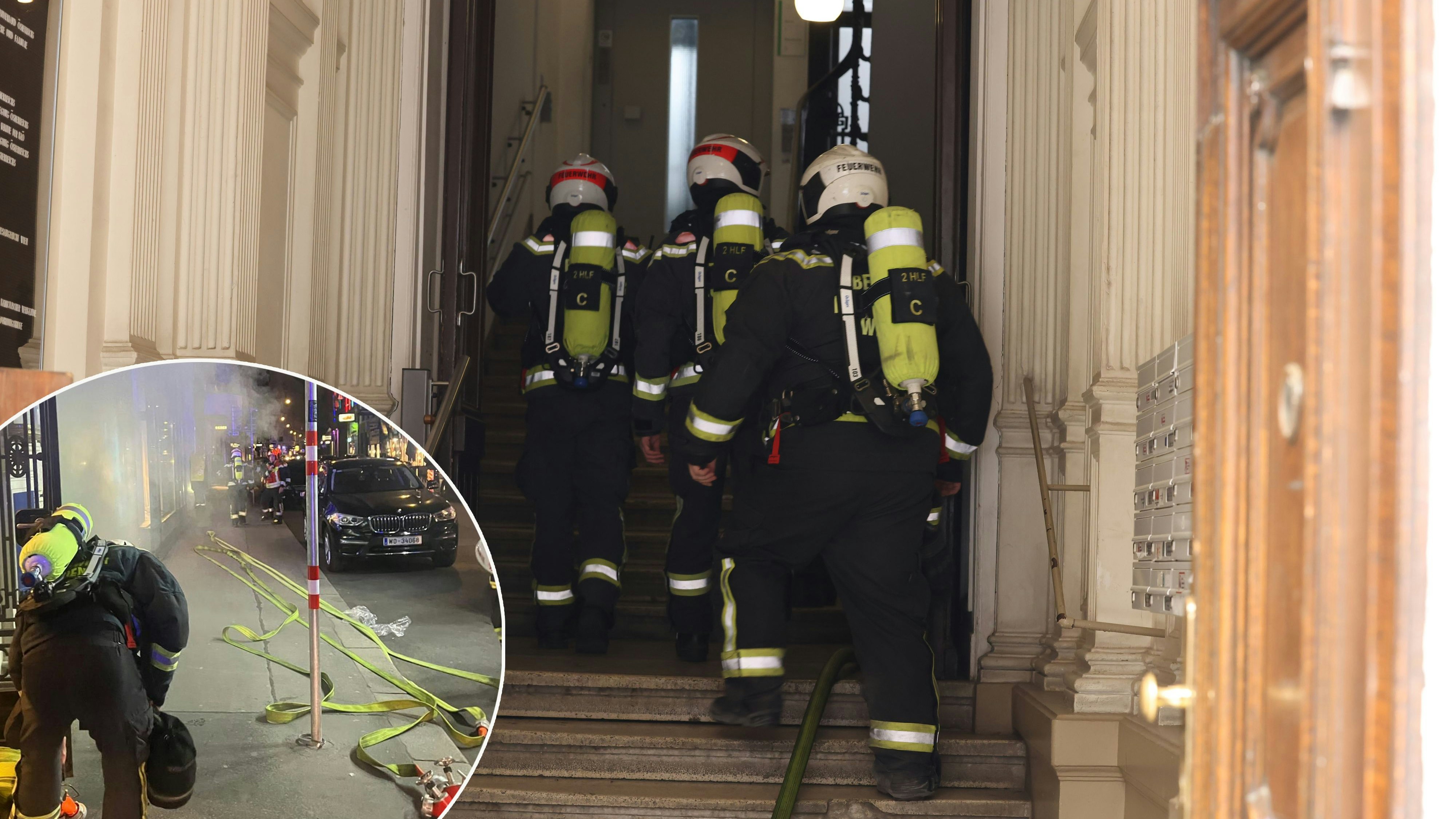 Feuerwehrleute steigen in das Zinshaus in der Spiegelgasse hinab – im verrauchten Keller wurde ein 28-jähriger Mann mit Stichwunde tot aufgefunden.