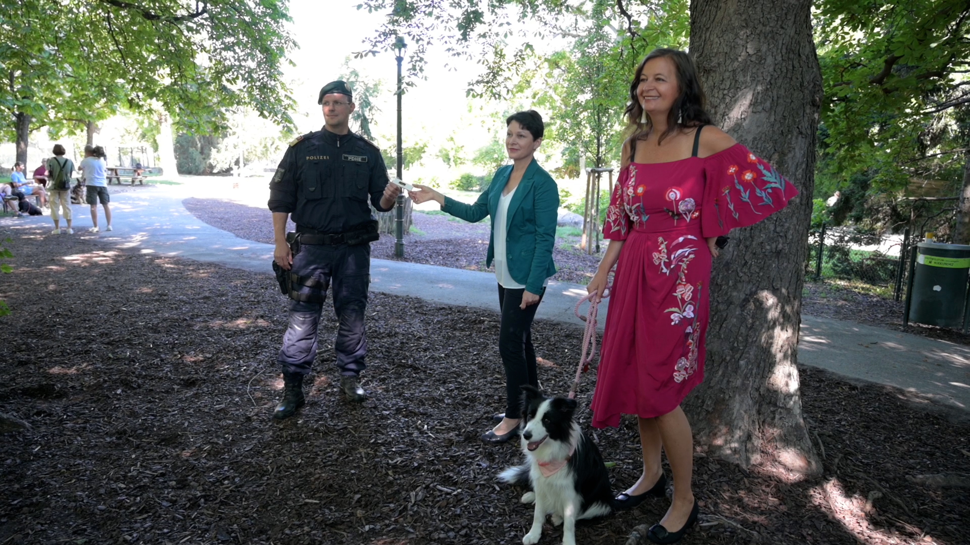 Ab sofort führen Polizei Wien und die Stadt wieder Schwerpunktkontrollen in Sachen Hundehaltung durch. (v.l.n.r.) Oberstleutnant Rudolf König (Leiter der Polizeidiensthundeeinheit) und Ruth Jily (Leiterin des Wiener Veterinäramts) halten ein Chiplesegerät, Tierschutzstadträtin Ulli Sima (SPÖ) Hündin Mavie an der Leine.