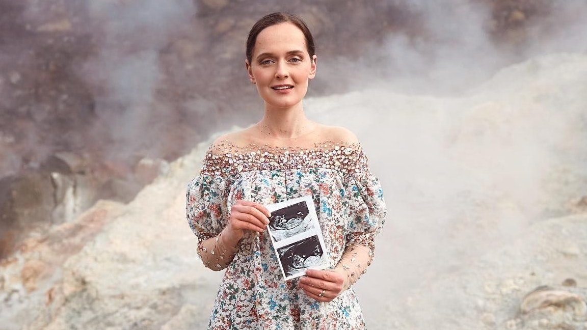 Eva Poleschinski hält das Ultraschalbild ihres ersten Kindes in die Kamera.