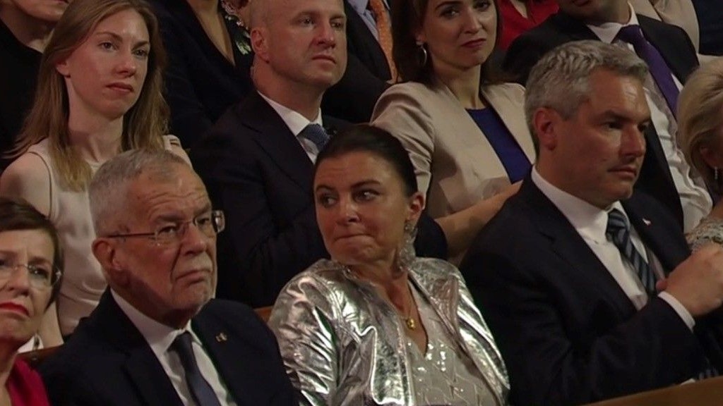Kanzlergattin Katharina Nehammer im Silberjäckchen bei der Eröffnung der Salzburger Festspiele.