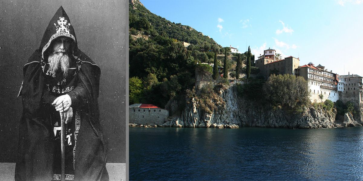 Mihailo Tolotos (li.) verbrachte sein Leben auf dem griechischen Berg Athos im Kloster (re.).