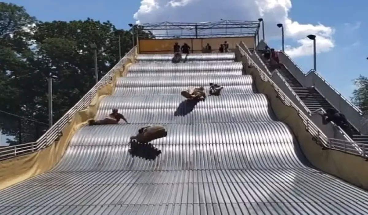 Bei der Wiedereröffnung der historischen Riesenrutsche flogen die Leute förmlich durch die Luft – ernsthaft verletzt wurde angeblich niemand.
