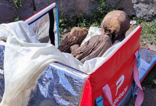 Bilder des Fundes zeigten die Mumie in einer fötalen Position in der roten Liefertasche.