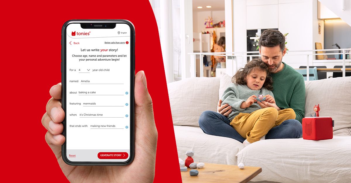 Die voreingestellte Eingabemaske unterstützt die Kundinnen und Kunden und gibt ihnen Anleitung und Ideen, um spannende Geschichten zu erfinden, lässt aber auch genügend Raum für die Kreativität und Fantasie ihrer Kinder.