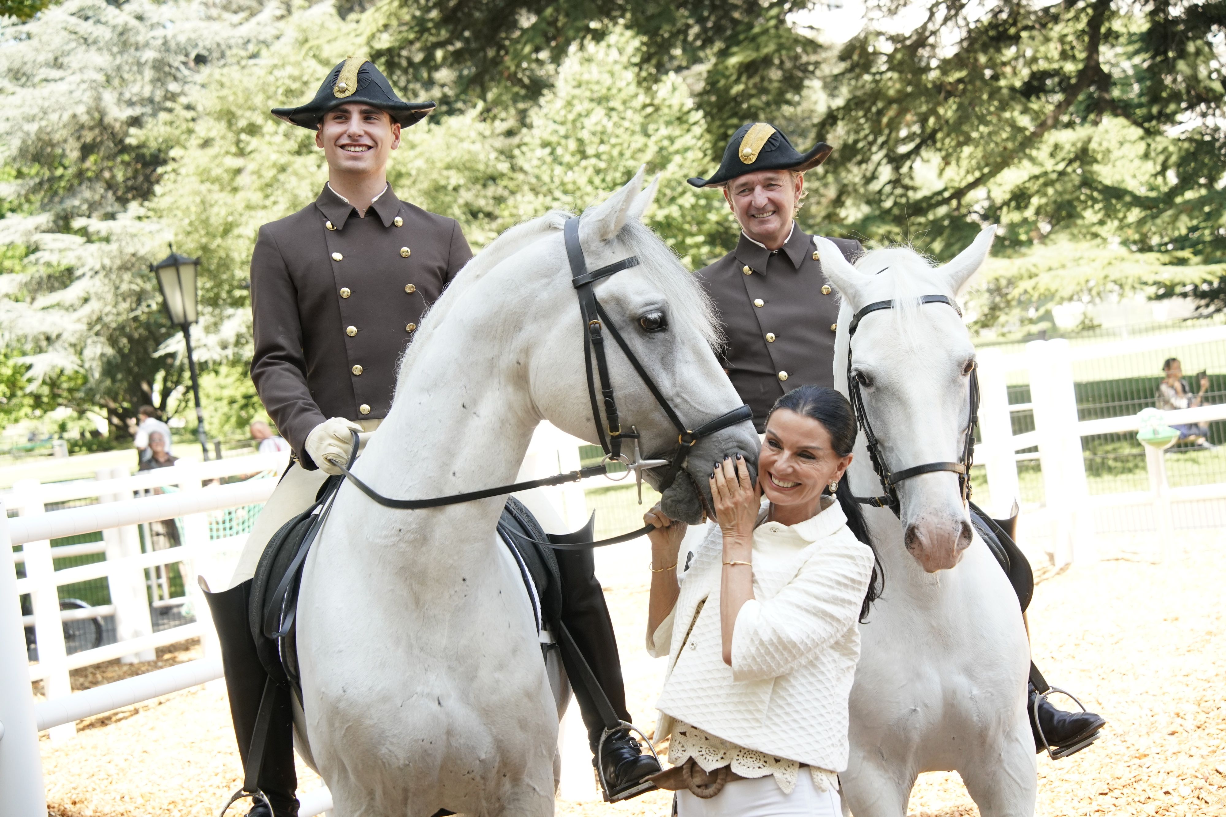 Sonja Klima, Geschäftsführerin der spanischen Hofreitschule, bekommt als Dankeschön für die neue Koppel ein Bussi vom Lipizzaner.