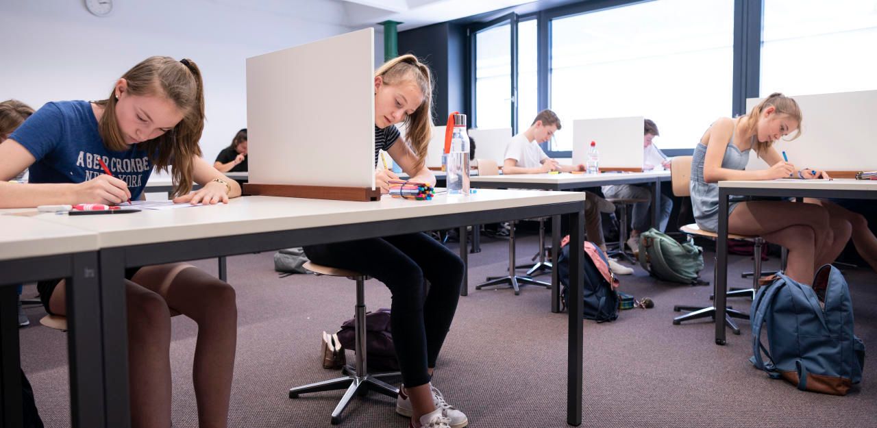 Symbolbild: Schüler schreiben eine Prüfung mit Sichtschutz zum Sitznachbarn.