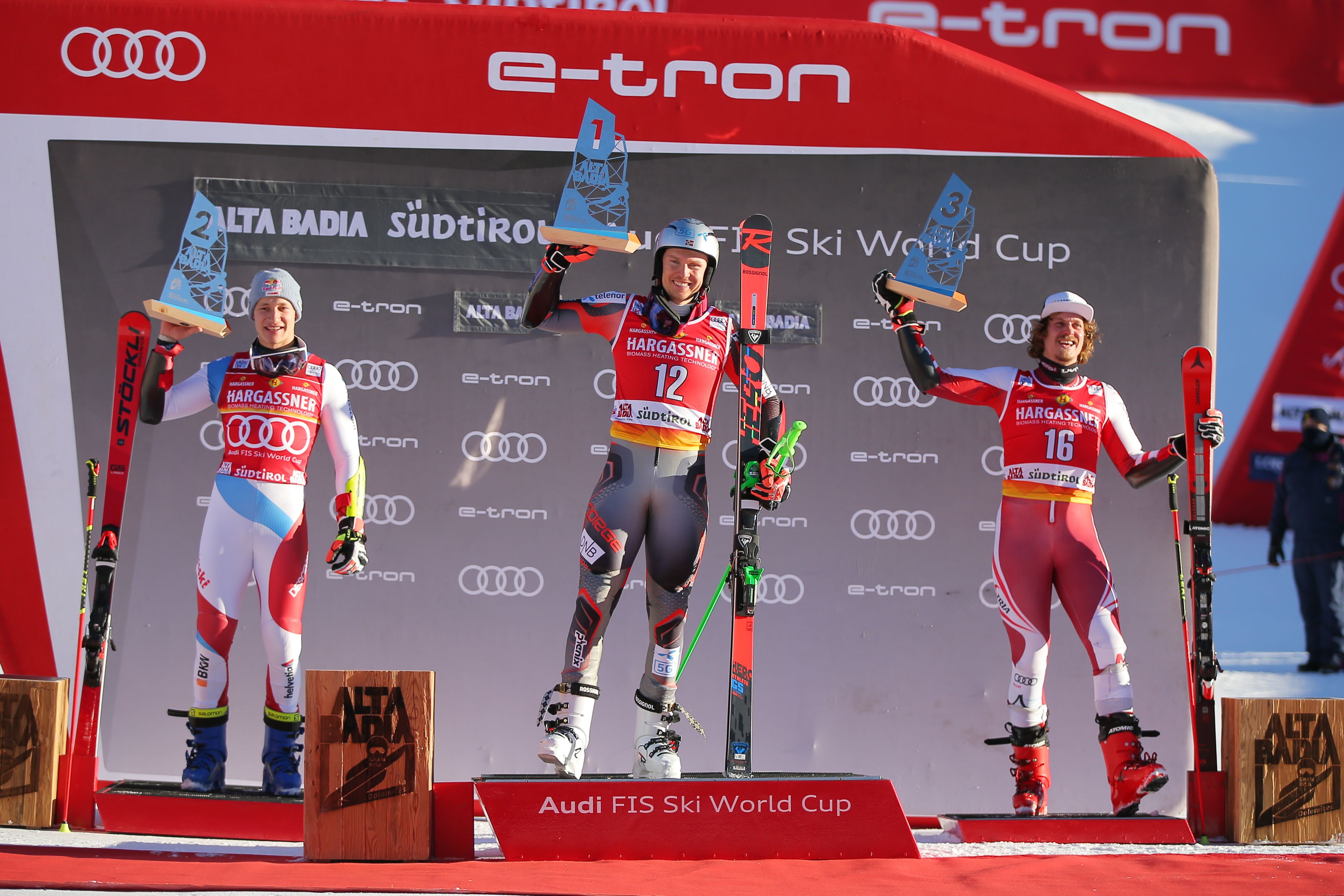 Kristoffersen gewann vor Odermatt (l.) und Feller (r.).