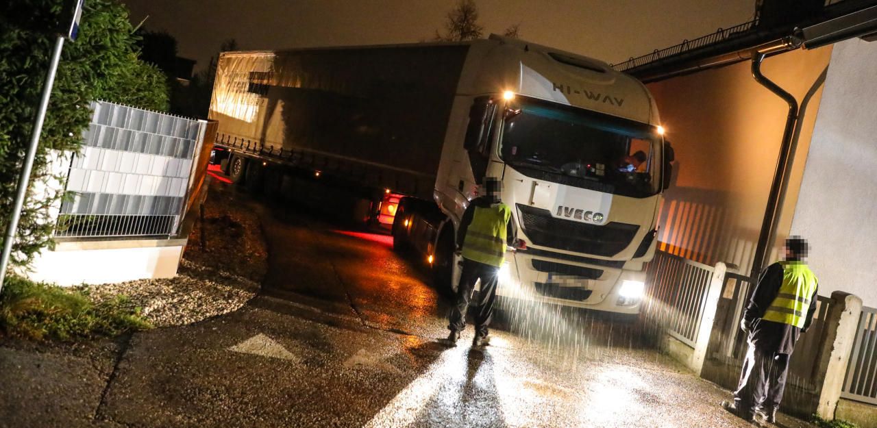 Das Schwerfahrzeug steckte zwischen Gartenhecke, Zaun und einer Dachrinne fest