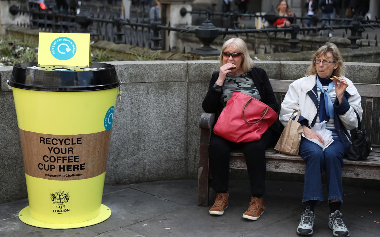 Die neuen knallgelben Recycling-Tonnen im Londoner Bankenviertel