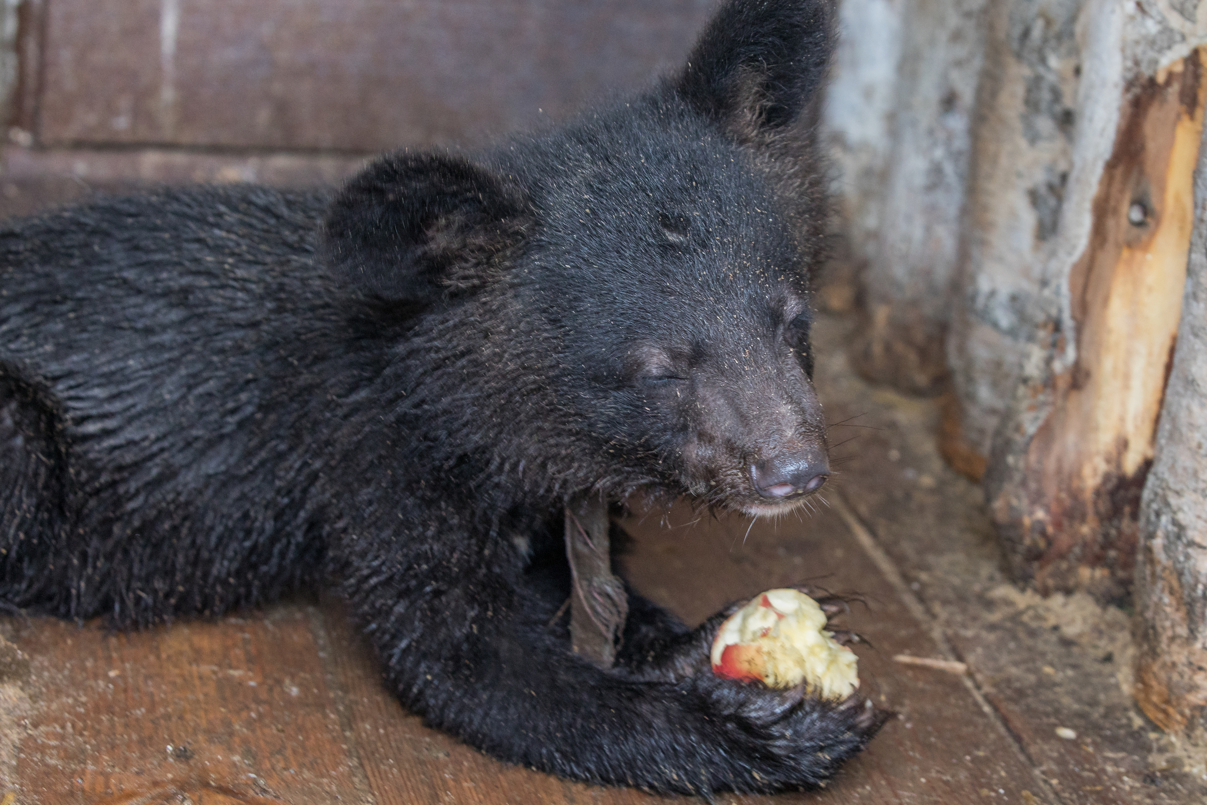 Ein Kragenbär-Junges verknuspert einen Apfel. Symbolbild