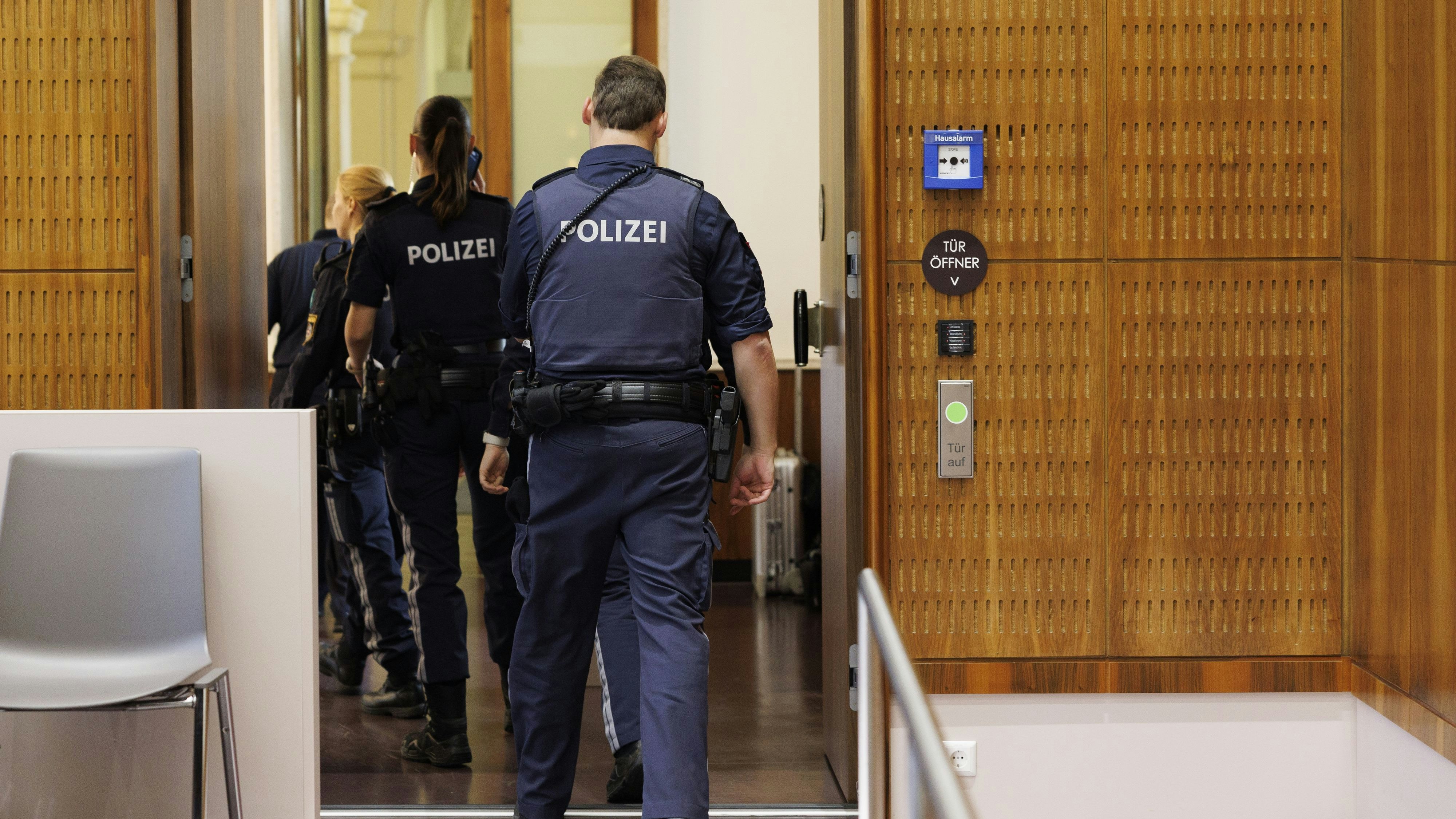 Polizisten begleiten den Angeklagten im Landesgericht Graz in den Verhandlungssaal. Der 25-jährige Syrer wurde zu fünf Jahren Haft verurteilt.