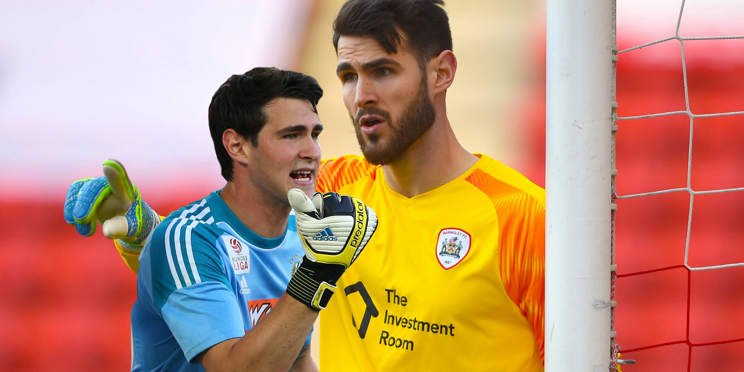 Samuel Sahin-Radlinger bei Barnsley (r.) und als Rapid-Keeper