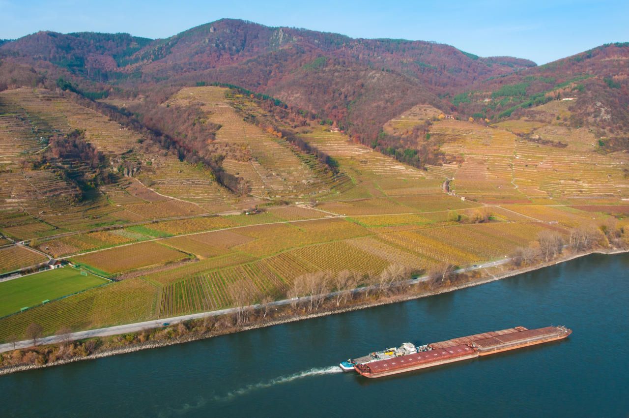Luftaufnahme von einem Schubverband, der gerade stromabwärts kurz vor Dürnstein in der Wachau (NÖ) unterwegs ist. Archivbild