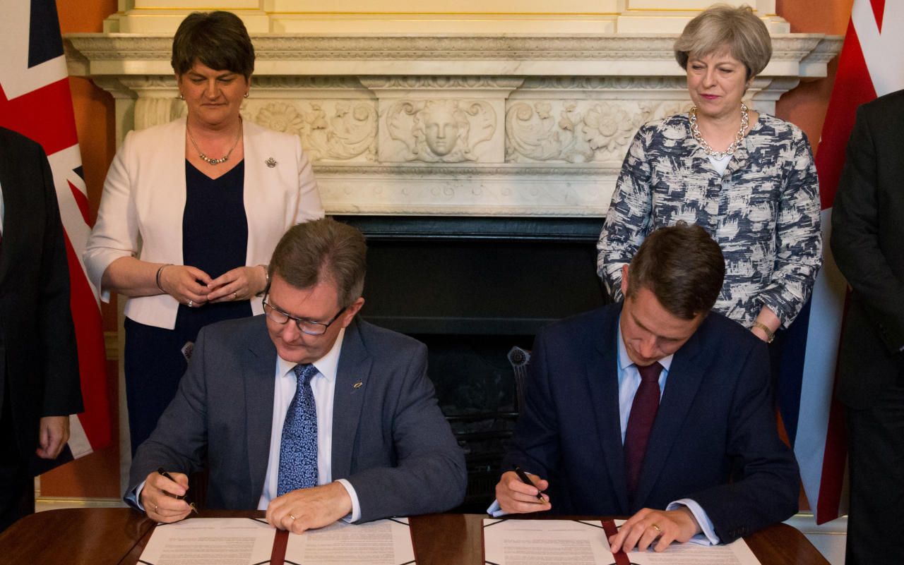 Mit Argusaugen überwachen Arlene Foster (l.) und Theresa May (r.) die Unterzeichnung der gegenseitigen Vereinbarung.