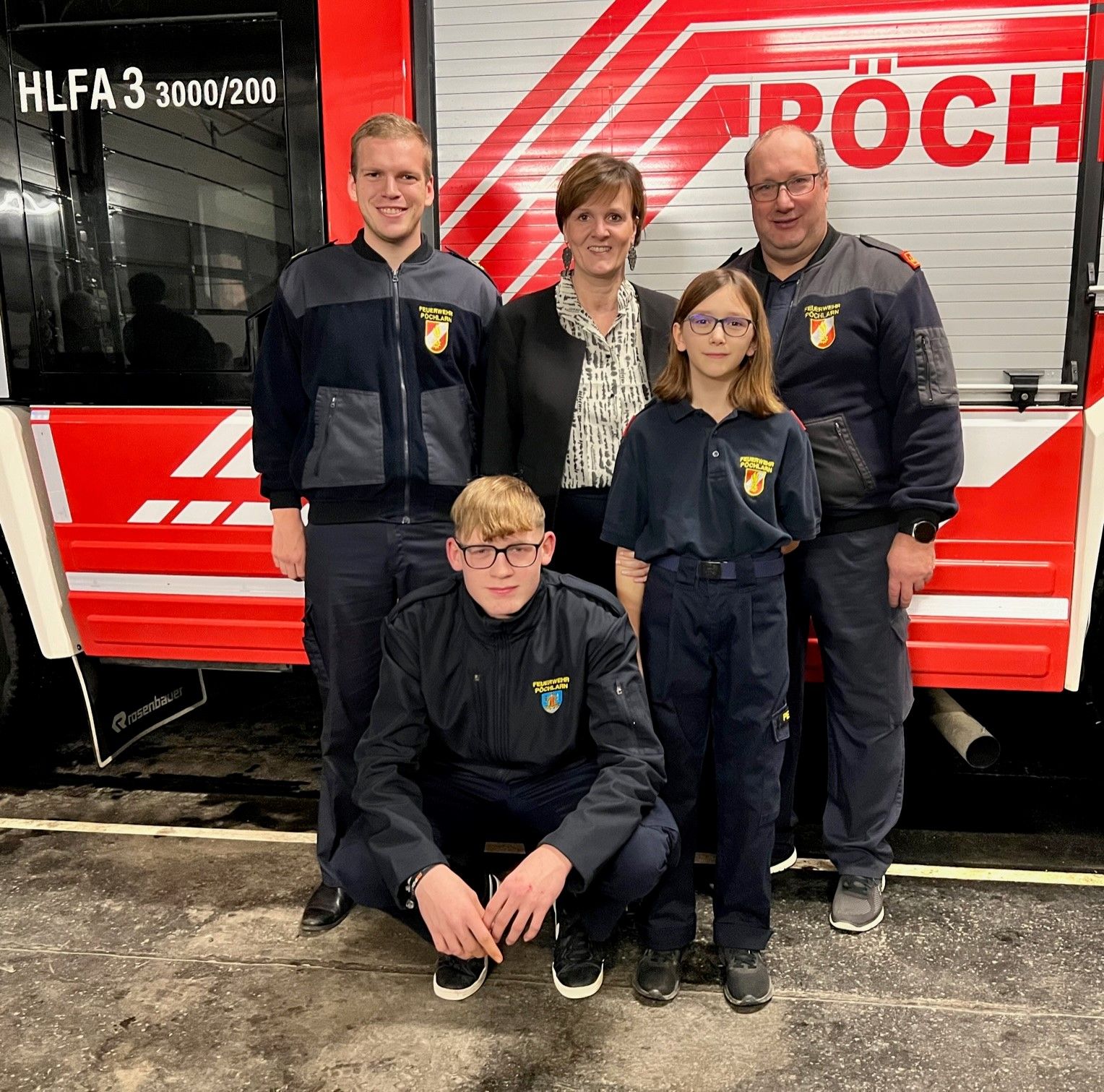 Thomas Stanek, Bürgermeisterin Barbara Kainz, Miriam Peham, FF-Kommandant Franz Albrecht und Benjamin Albrecht (vorne hockend).