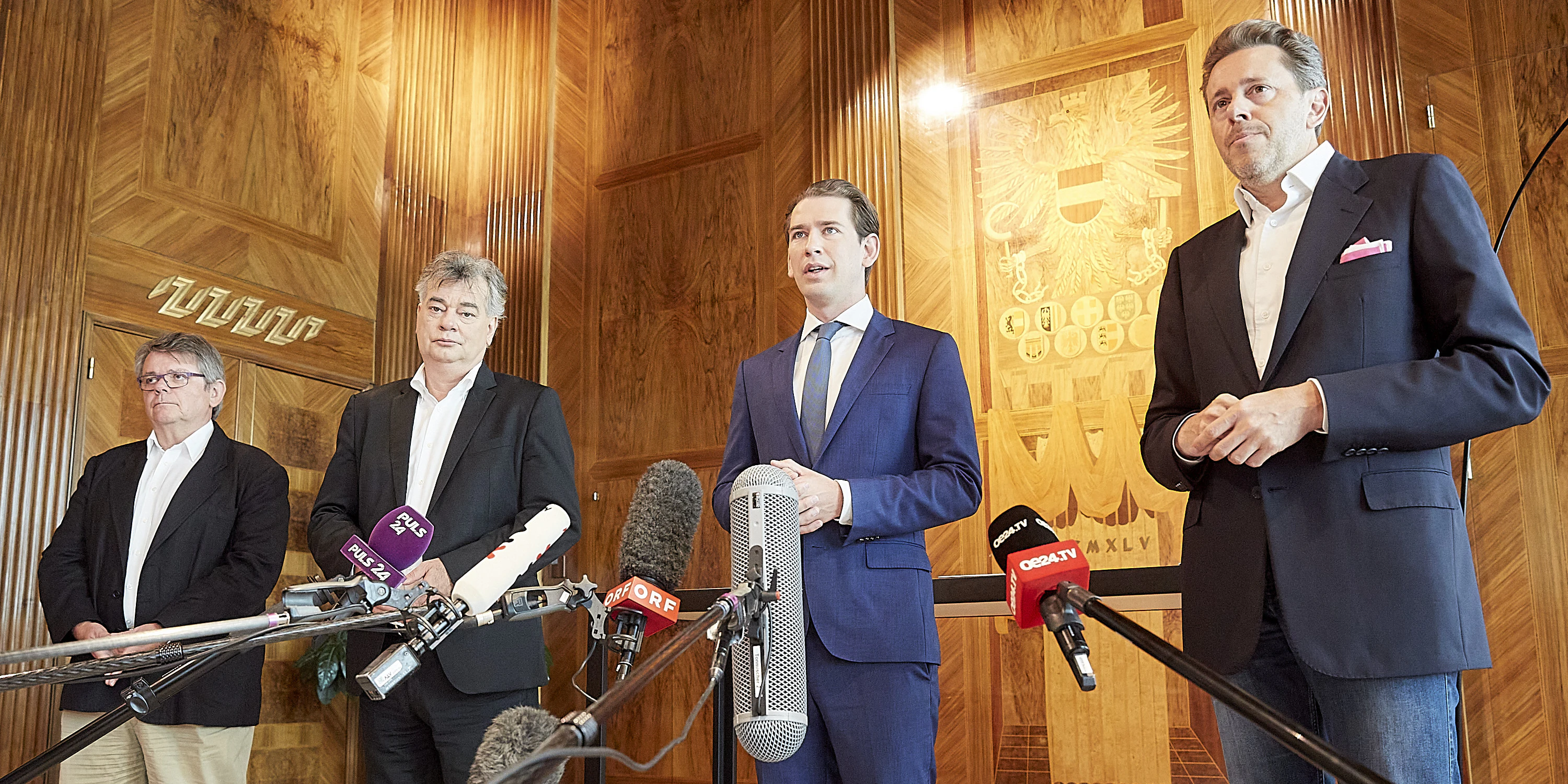 ÖGB-Chef Wolfgang Katzian, Vizekanzler Werner Kogler, Bundeskanzler Sebastian Kurz, Wirtschaftskammer-Chef Harald Mahrer.
