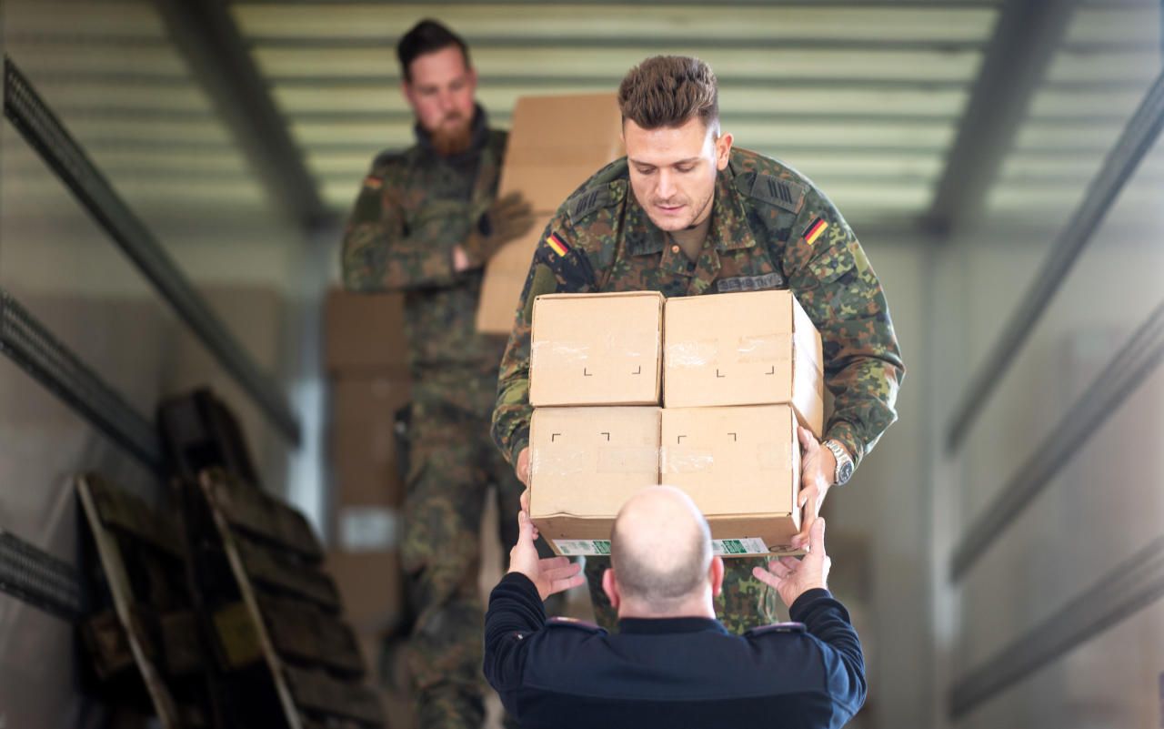 Bundeswehr-Soldaten bei der Verladung von Schutzausrüstung in Erkelenz, Nordrhein-Westfalen.