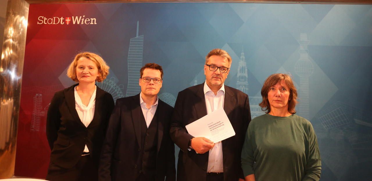 MA40-Leiterin Agnes Berlakovich, Bildungsstadtrat Jürgen Czernohorszky, Sozialstadtrat Peter Hacker und die grüne Sozialsprecherin Birgit Hebein