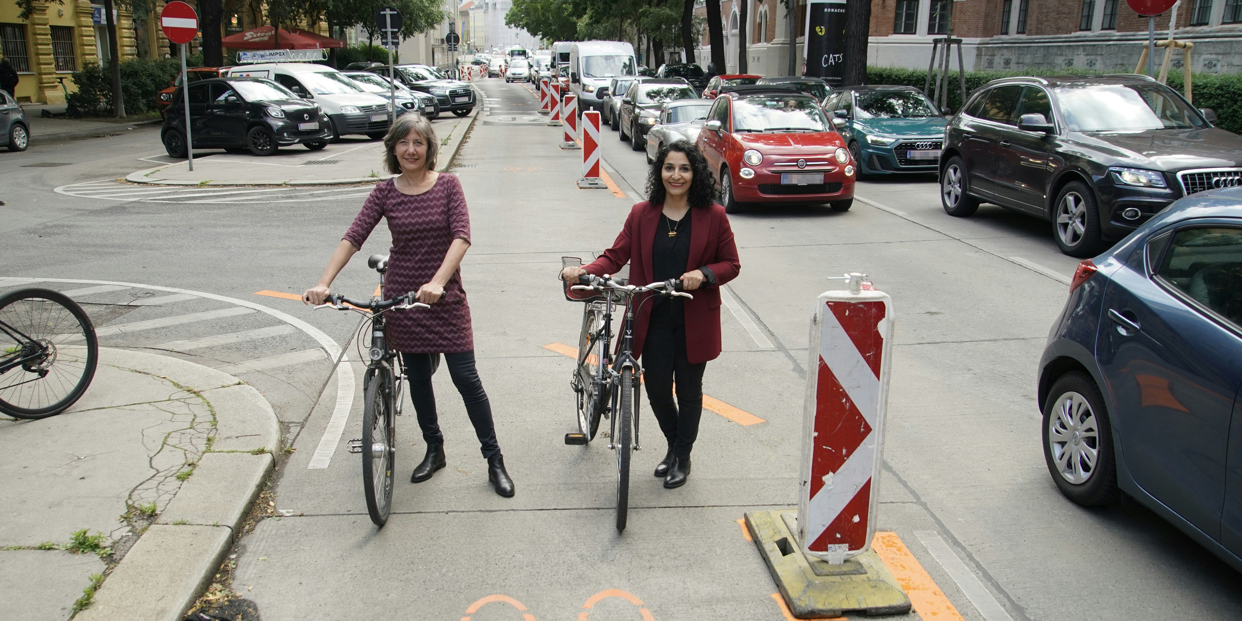 Vizebürgermeisterin Birgit Hebein (Grüne, li.) und Alsergrund-Bezirkschefin Saya Ahmad (SPÖ) eröffnen den Pop-up-Radweg Hörlgasse.