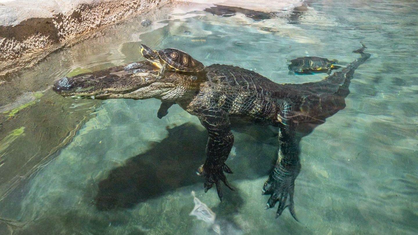 Die Schildkröten schreckt die Größe des Alligators offenbar nicht.