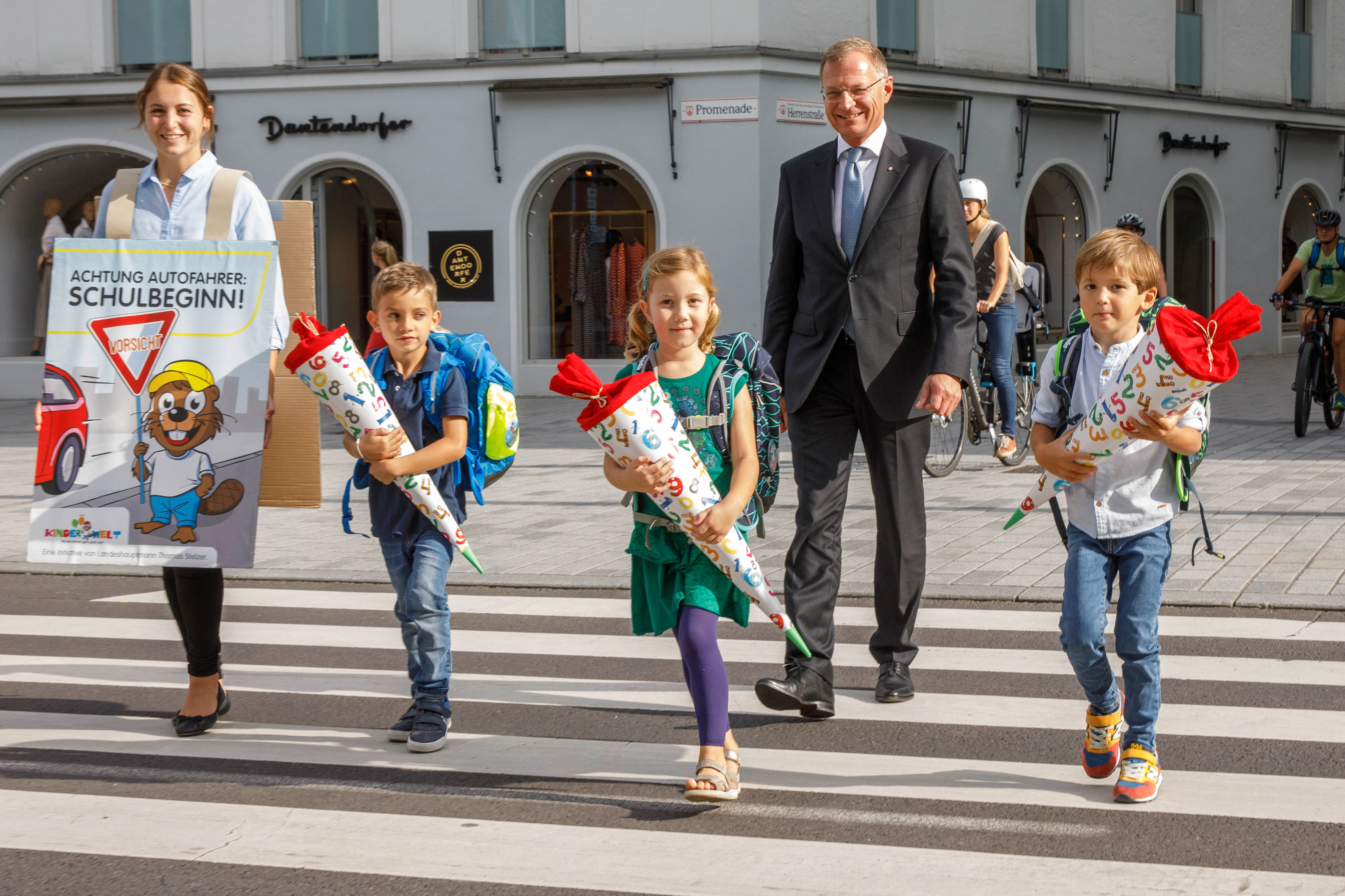 Landeshauptmann Thomas Stelzer bittet gemeinsam mit den Erstklässlern Anna, Anton und Matthäus um Vorsicht im Straßenverkehr.