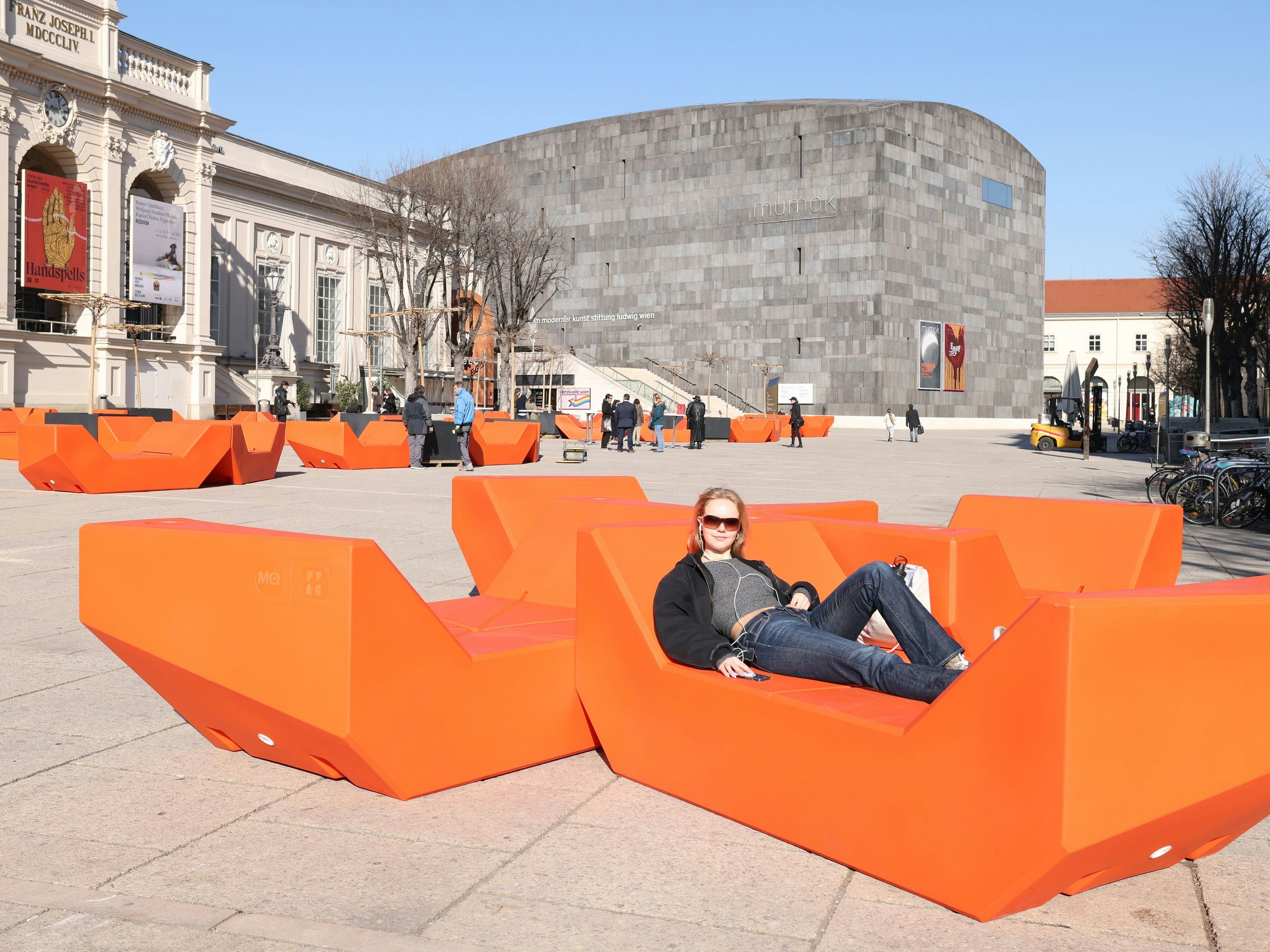 Luisa (16) ist eine der Ersten, die auf den neuseten Möbeln im Wiener Museumsquartier Probe liegt.