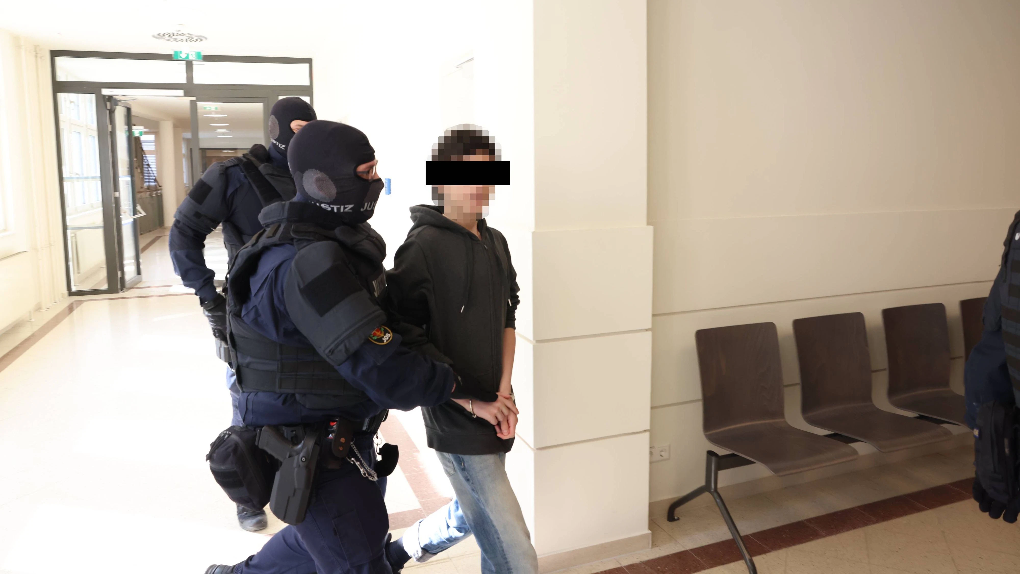 Maskierte Justizwache führt den 15-Jährigen in den Gerichtssaal.