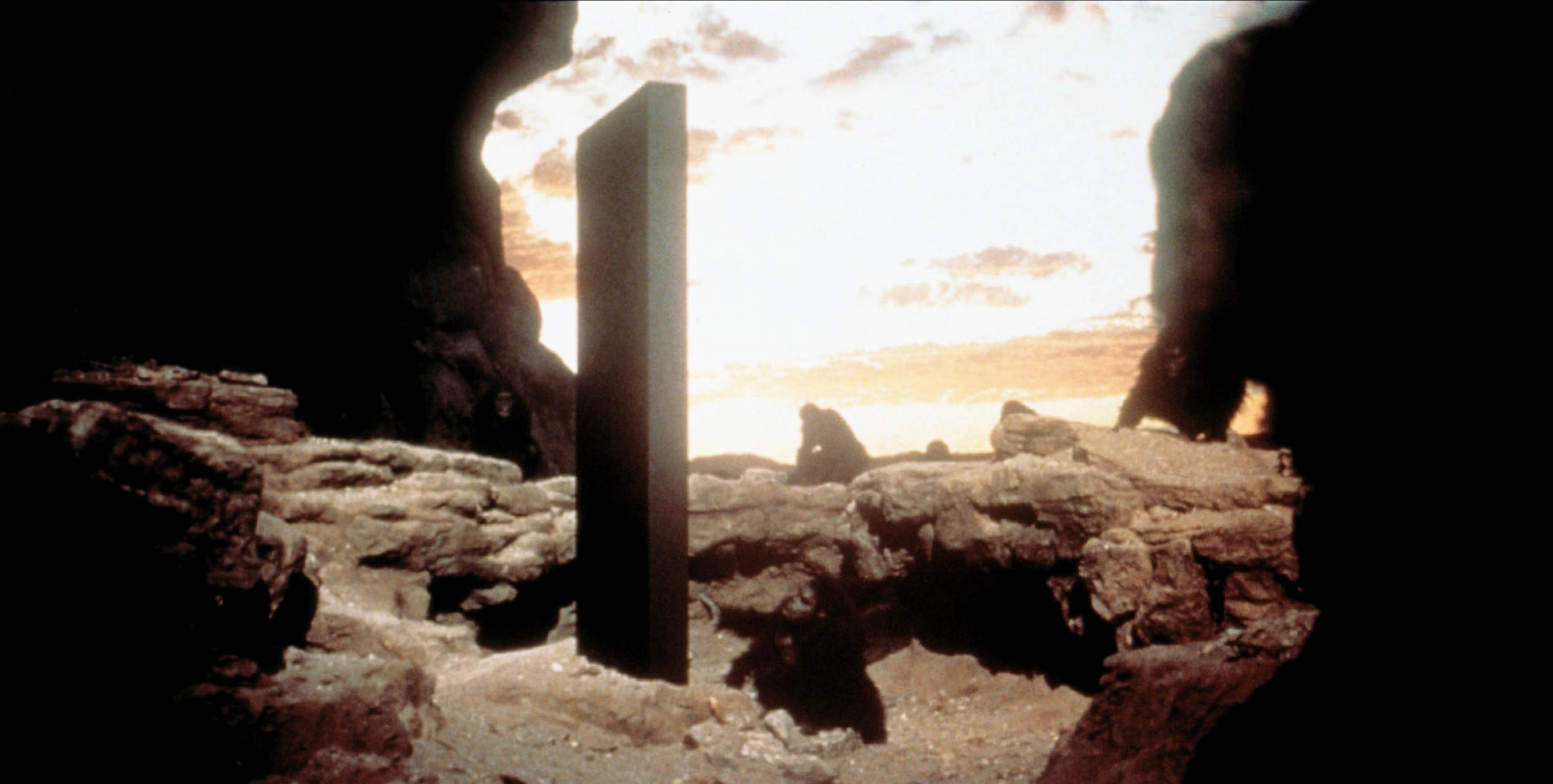Szene aus "2001: A Space Odyssey": Steinzeitliche Affenmenschen untersuchen einen seltsamen Monolithen in der Wüste