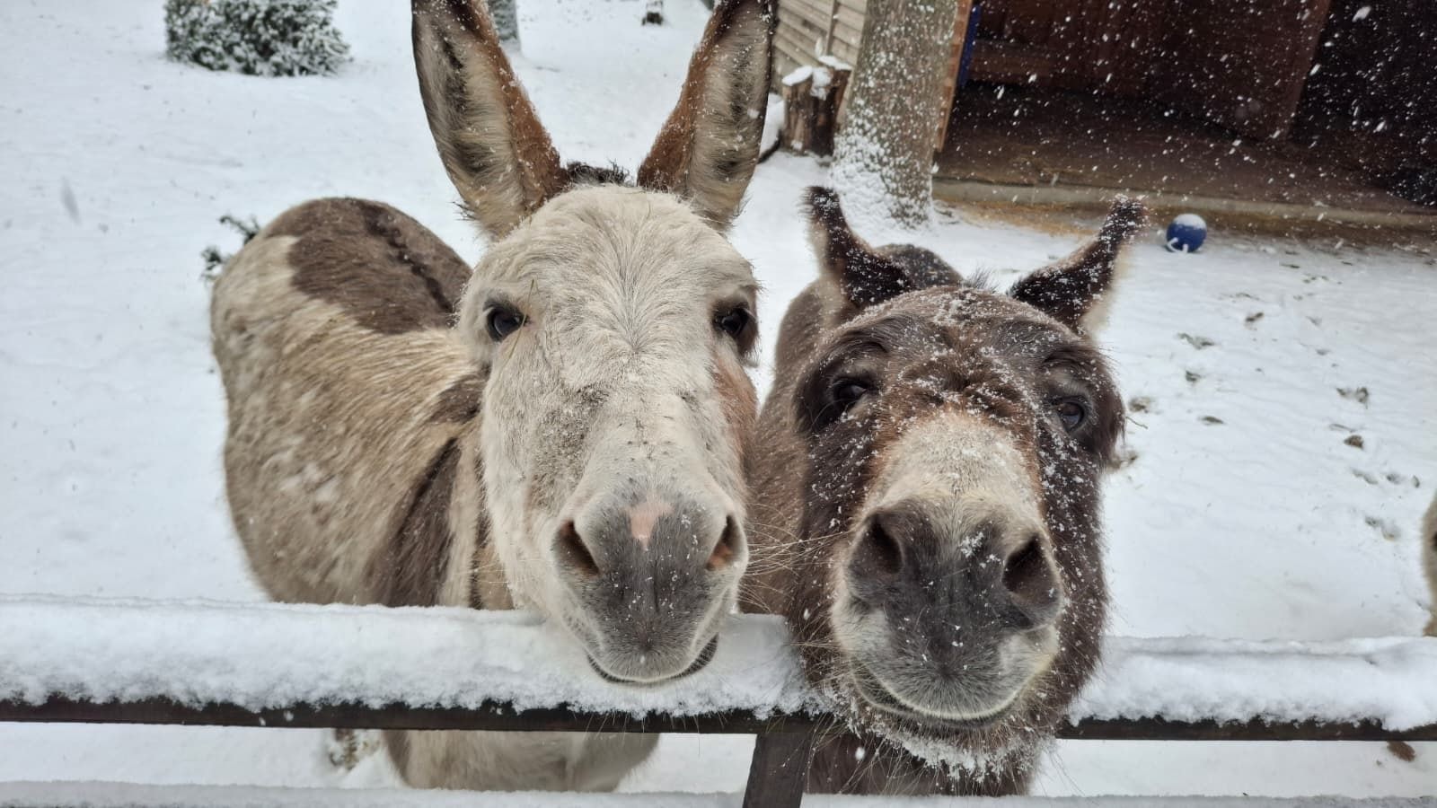 Die Eseln "Aristoteles" und "Mädi" finden Schnee offenbar extrem amüsant.