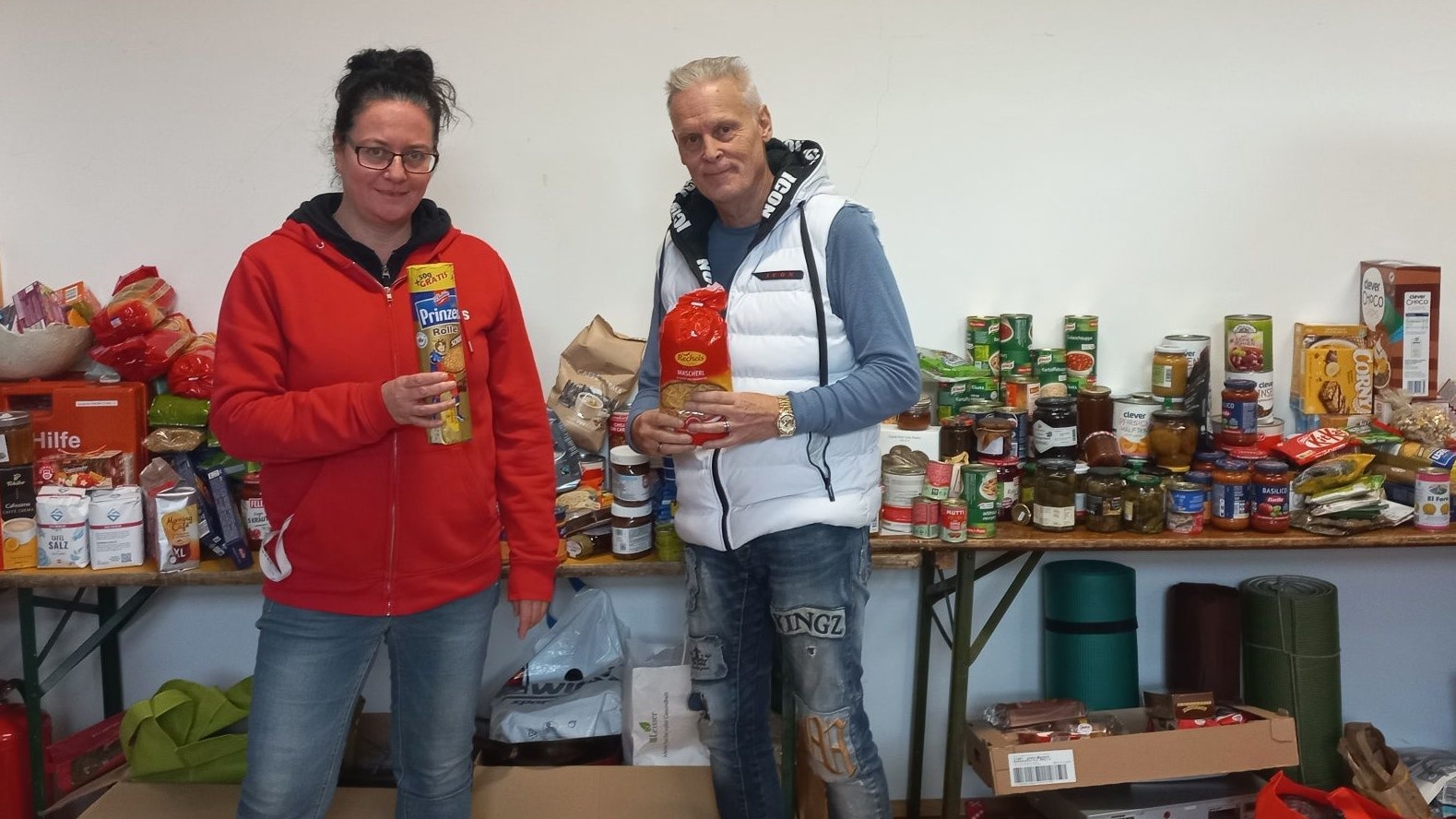 Leiterin Susanne Takacs und Bewohner Ronald mit den zahlreichen Sachspenden, die in der Triester Straße abgegeben wurden.