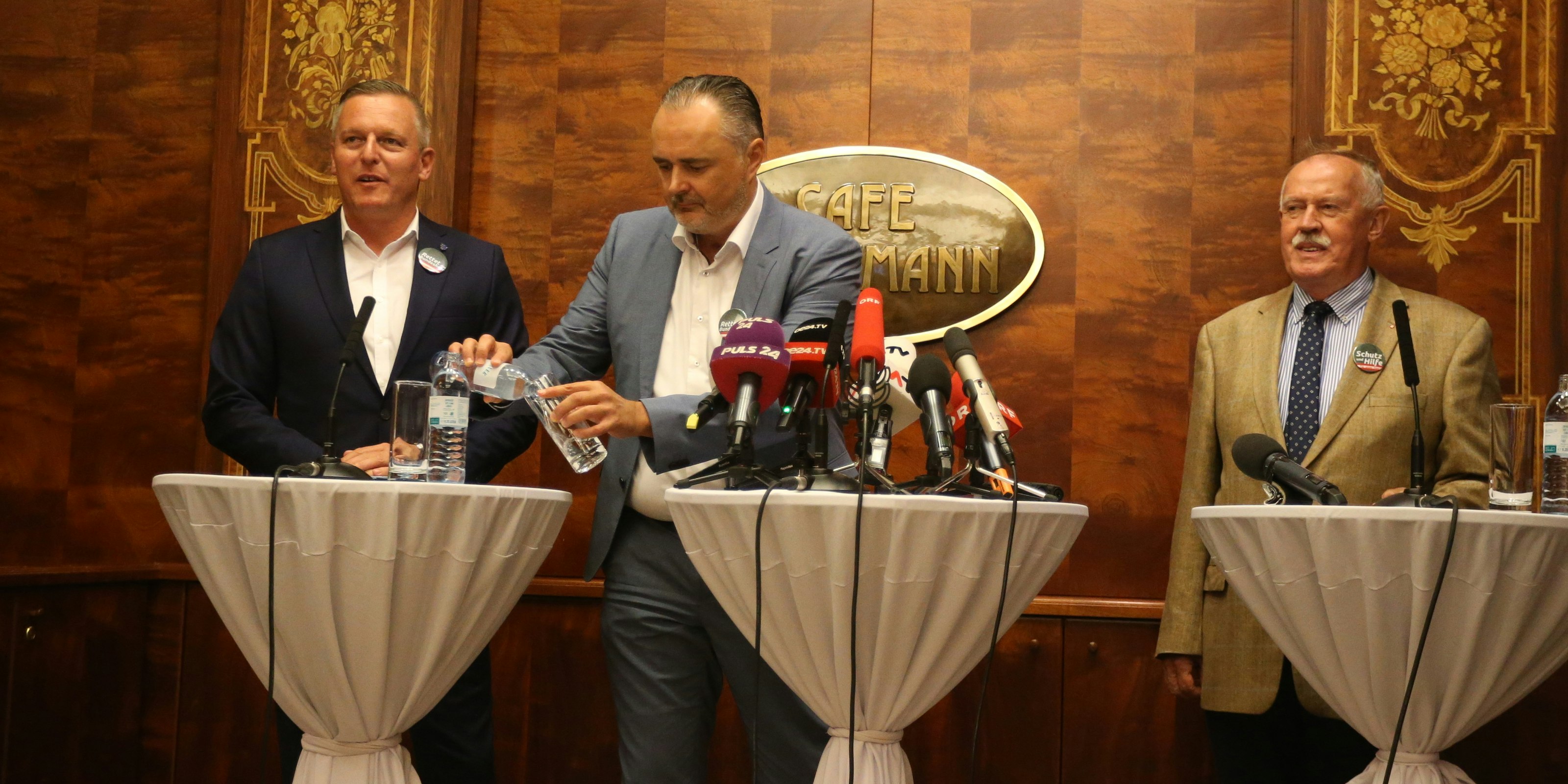 Burgenland-LH Doskozil (SP, Mitte) schenkte der Bundesregierung am Montag bei einer Pressekonferenz ein.
