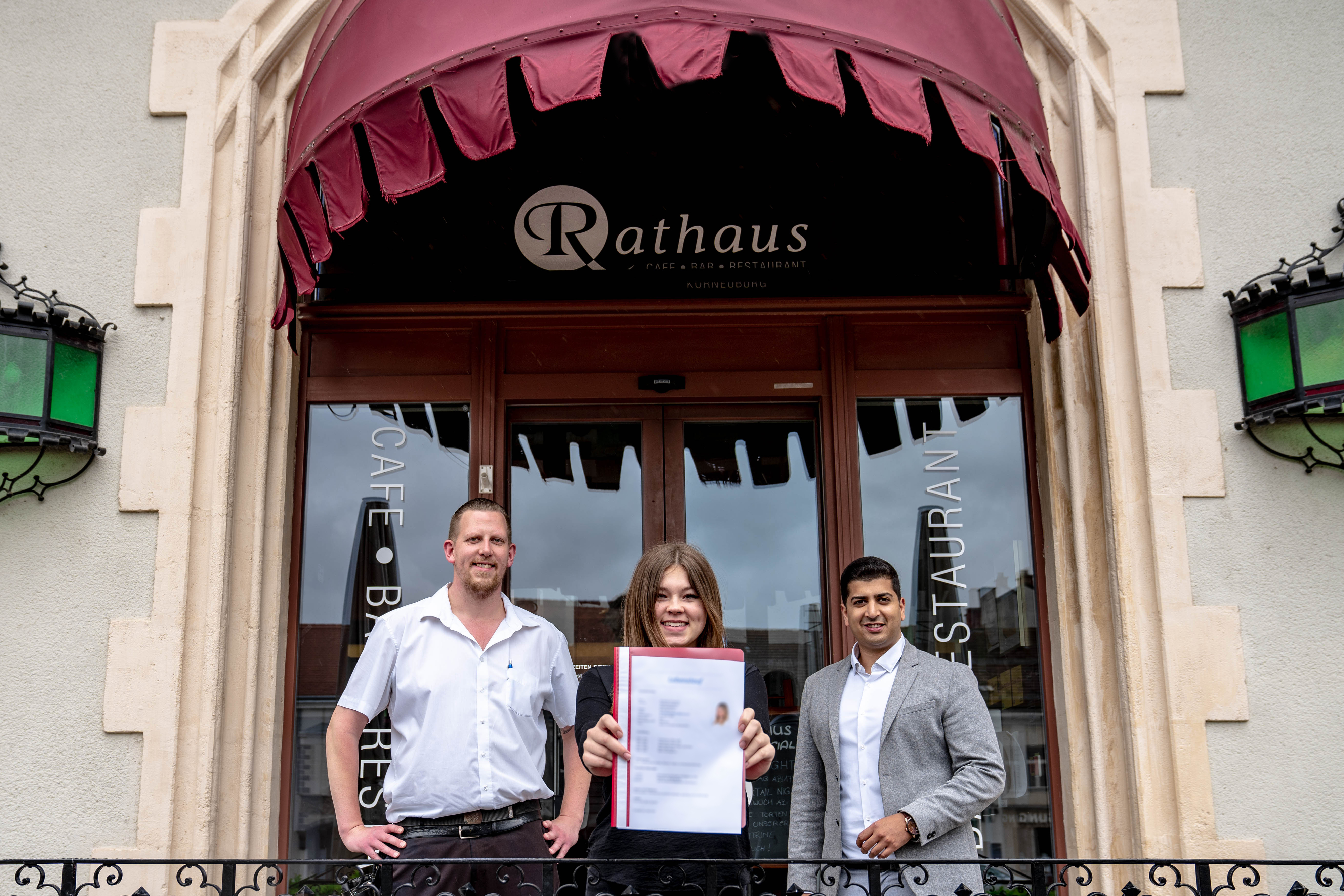 Bei ihrer neuen Lehrstelle: Samantha T. mit Rathaus-Café-Besitzer Martina Schödl und Gewerkschafter Sumit Kumar