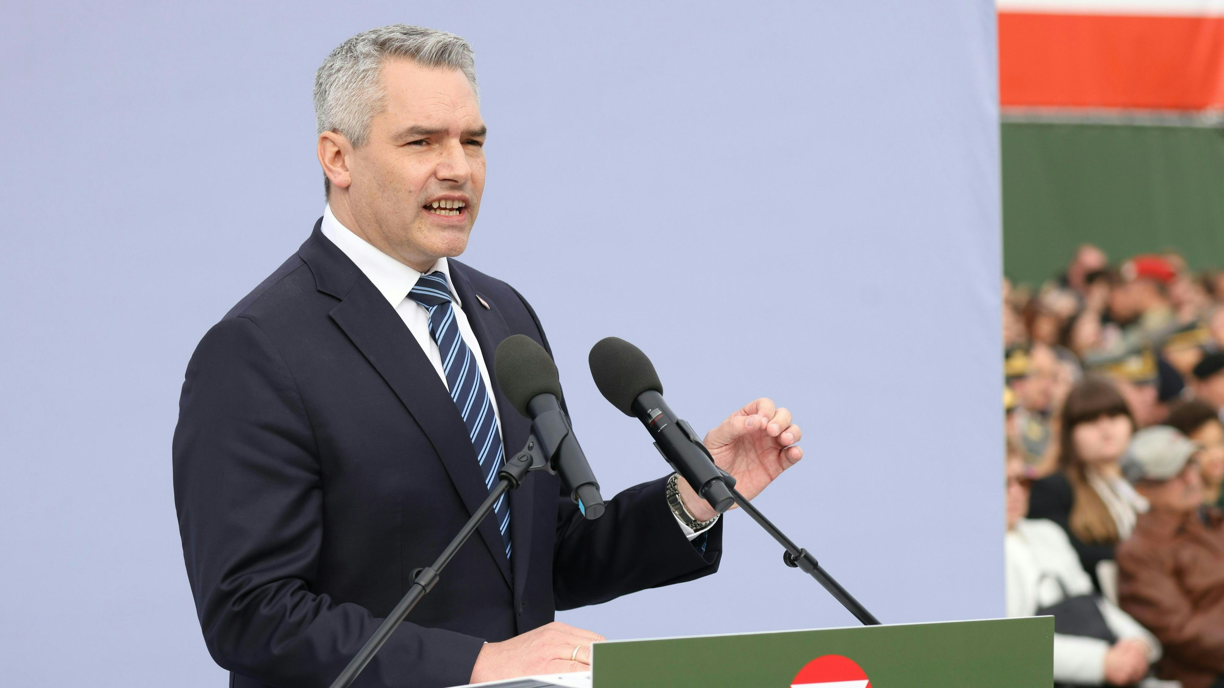Kanzler Karl Nehammer sprach am Donnerstag bei der Angelobung der Rekruten am Heldenplatz.