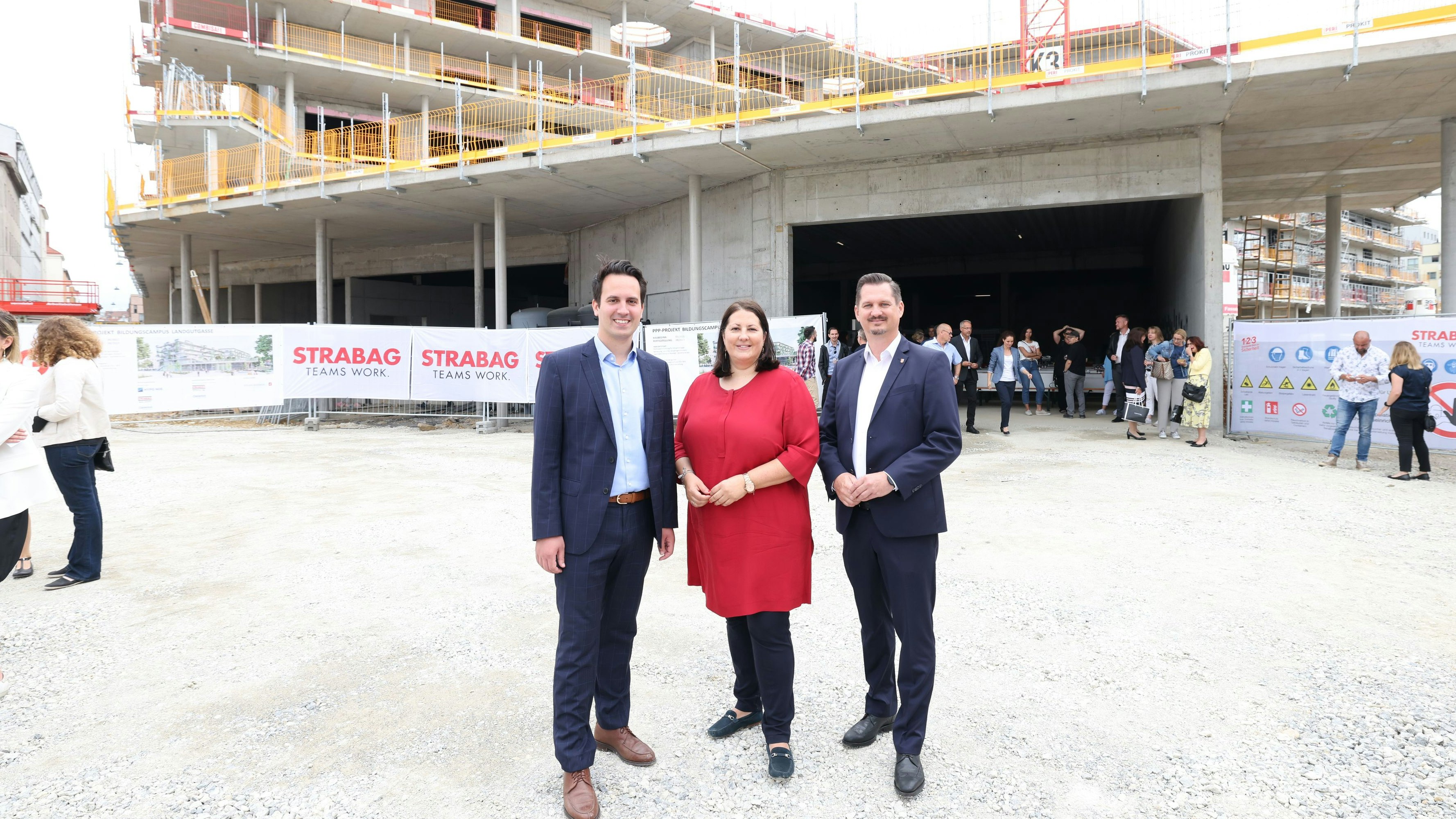 Dachgleiche für den Bildungscampus in Favoriten mit Bildungsstadtrat Christoph Wiederkehr (Neos), Wohnbaustadträtin Kathrin Gaal (SPÖ) und Favoritens Bezirkschef Marcus Franz (SPÖ).