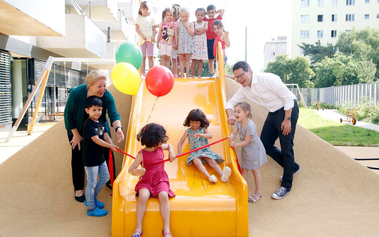 Kindergarten-Abteilungsleiterin Daniela Cochlar und Bildungsstadtrat Jürgen Czernohorszky (SPÖ) eröffneten den neuen Kindergarten in der Ehamgasse in Wien-Simmering.