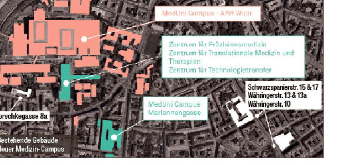 Ein riesiger neuer MedUni-Campus entsteht. Die türkisen Elemente sind neu. Bis 2030 sollen die Gebäude stehen.