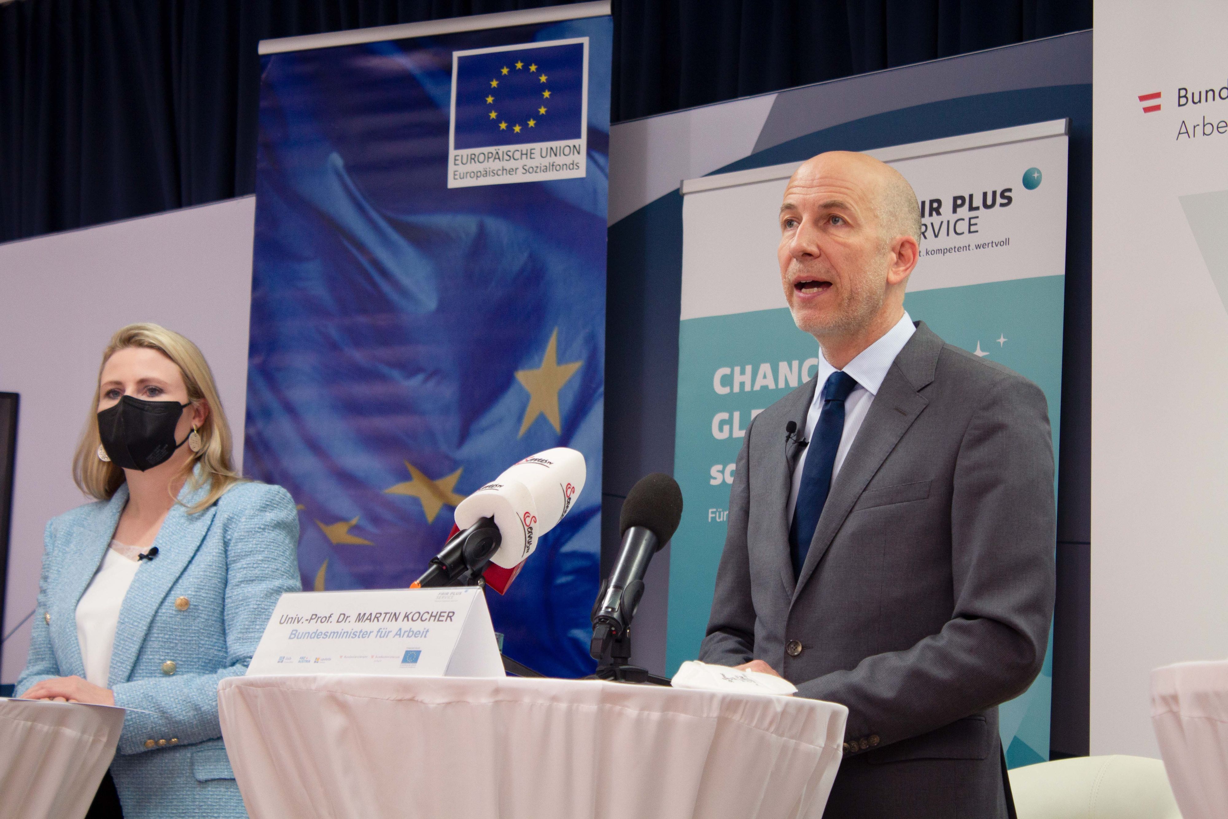 Frauenministerin Susanne Raab und Arbeitsminister Martin Kocher stellen das neue Projekt "Fair Plus Service" vor. Dieses soll Frauen am Arbeitsmarkt fördern.