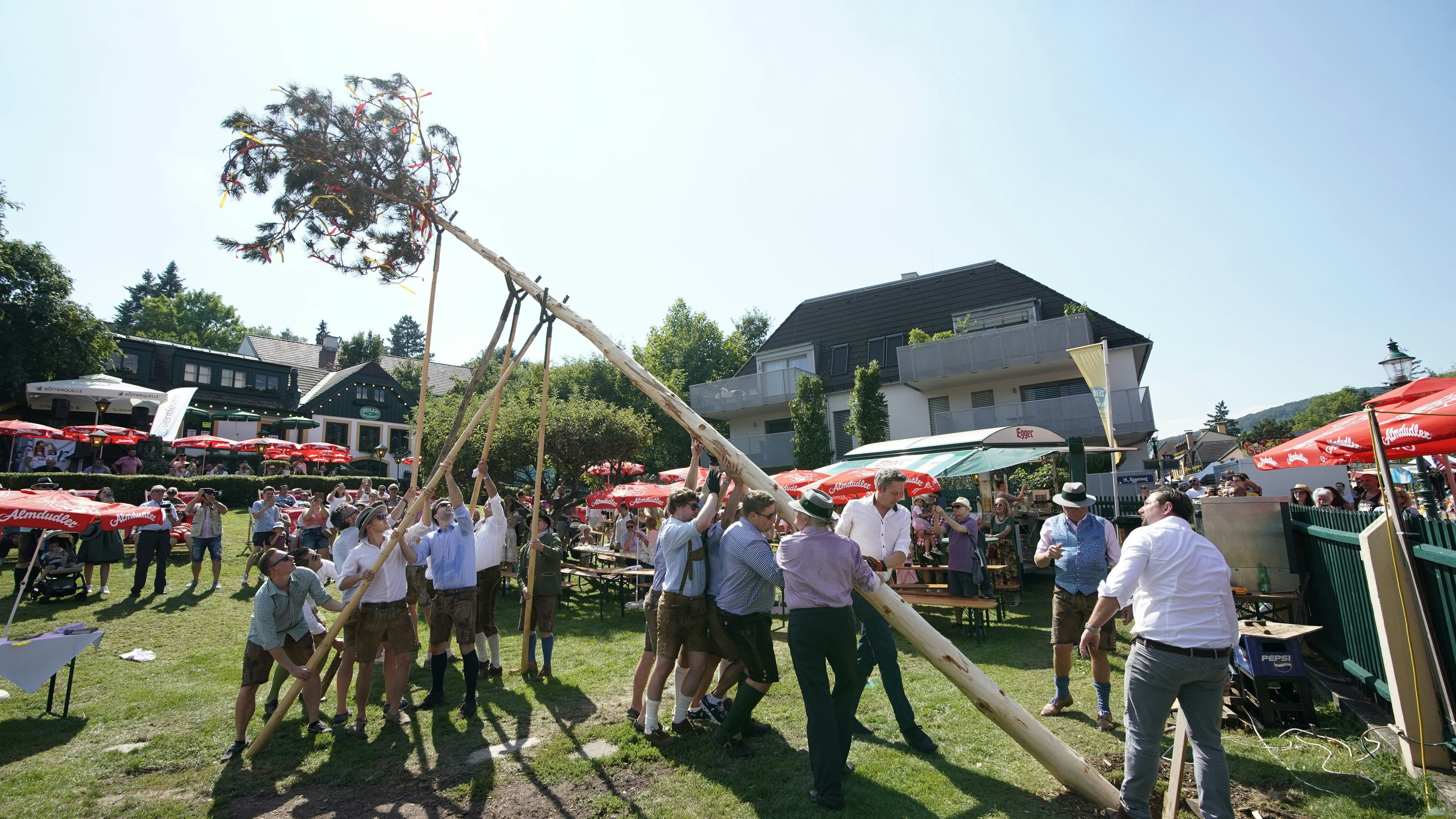 Der traditionelle Hiatabaum ist ein Symbol der Neustifter Weinbauern. Er wurde gesegnet, auf Schultern getragen und im Anschluss aufgestellt.