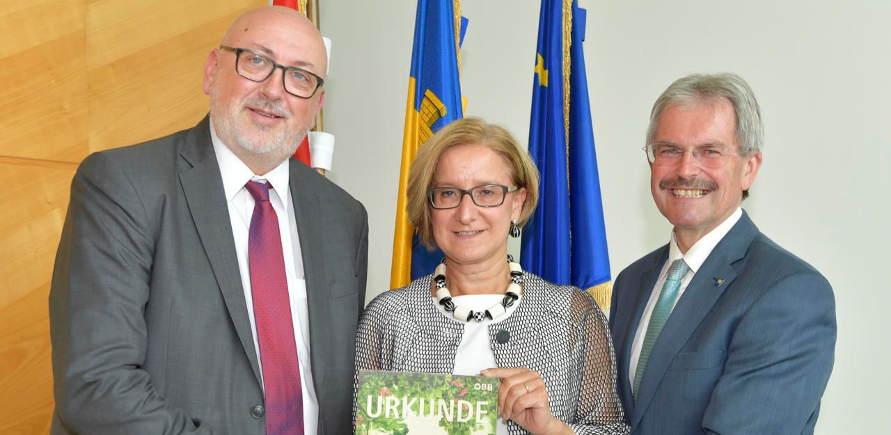 Überreichung der Green Points-Urkunde: ÖBB-Vorstandsvorsitzender Andreas Matthä, Landeshauptfrau Johanna Mikl-Leitner und Verkehrs-Landesrat Karl Wilfing (v.l.n.r.)