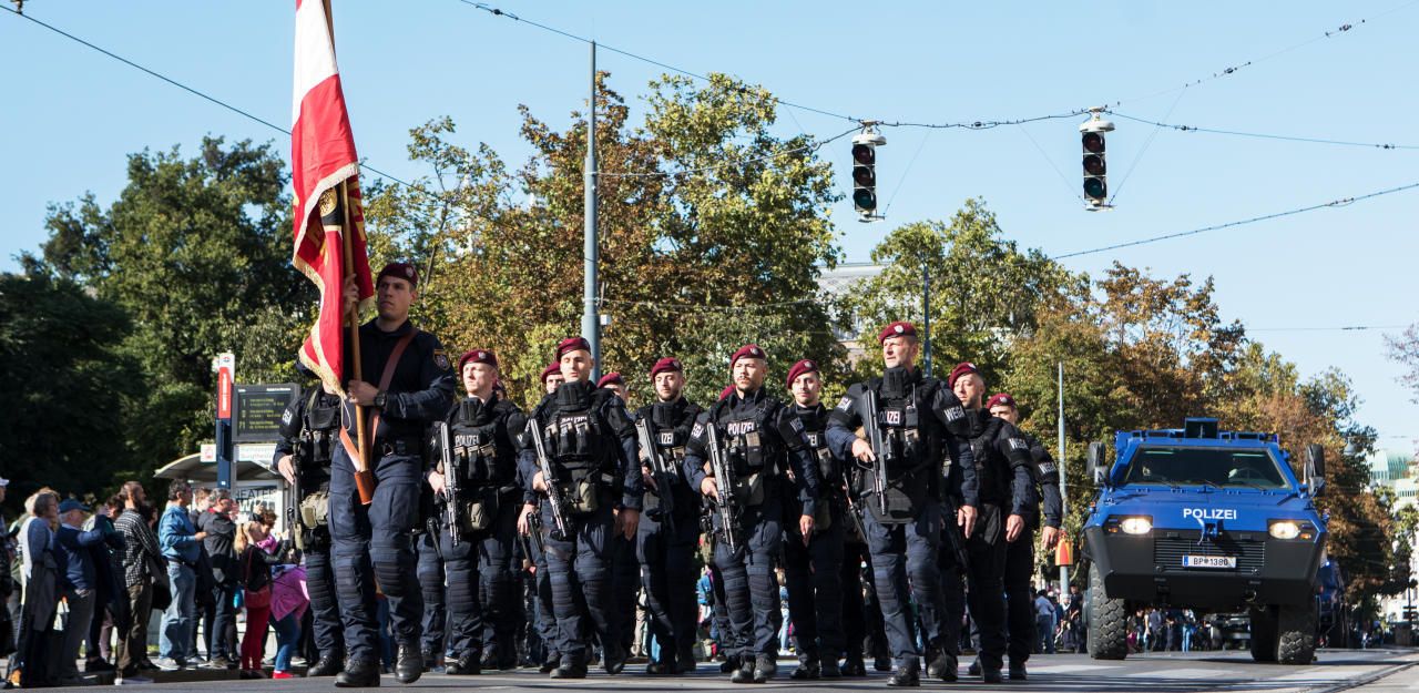 Bewaffnete Angehörigen der Polizei Sondereinheit Wega mit gepanzerten Polizeifahrzeug während einer Parade an der Ringstrasse in Wien, fotografiert am 21. September 2019. Die Wiener Polizei feiert 150 jähriges bestehen.