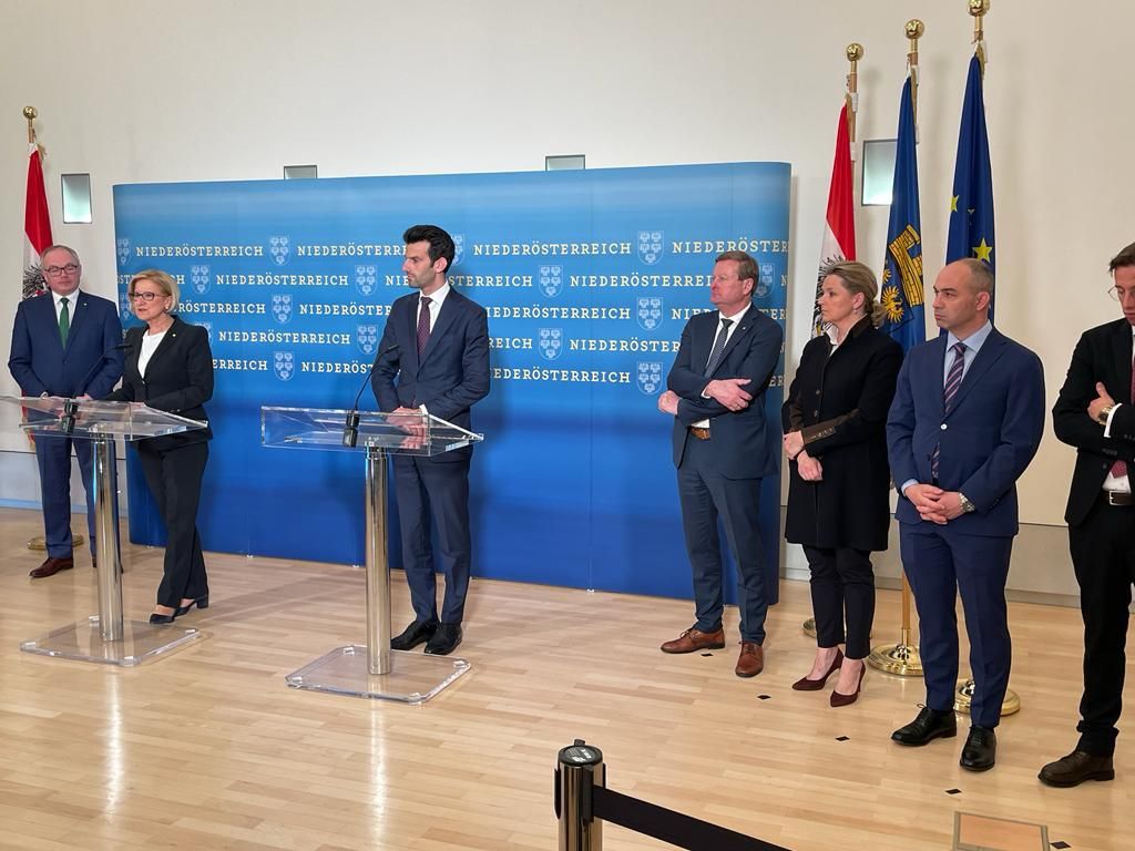 Die neue Landeschefin Johanna Mikl-Leitner mit Vize Udo Landbauer und den neuen Regierungsmitgliedern der FP.