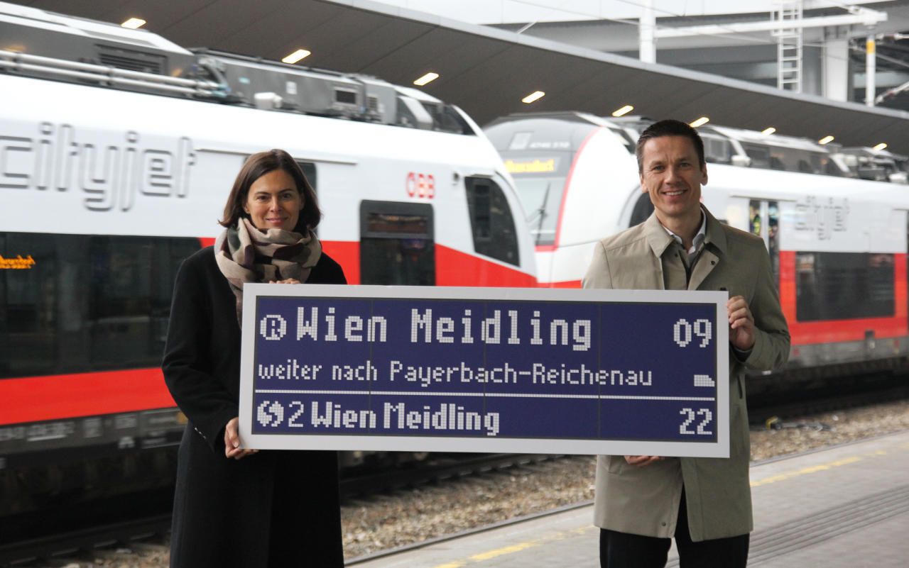 Die neuen Anzeigen zeigen neben dem Fahrziel auch die Minuten bis zur Ankunft der S-Bahn an. Silvia Angelo ( Vorstandsdirektorin ÖBB-Infrastruktur AG) und Robert Tüchler (Projektleiter Relaunch Wiener Schnellbahn ÖBB-Infrastruktur AG) stellten die neuen Tafeln vor. (c) ÖBB/Beer