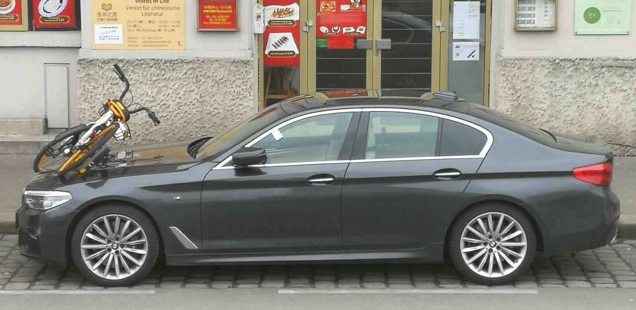 Suboptimal geparkt: Ein oBike auf der Motorhaube eines BMWs
