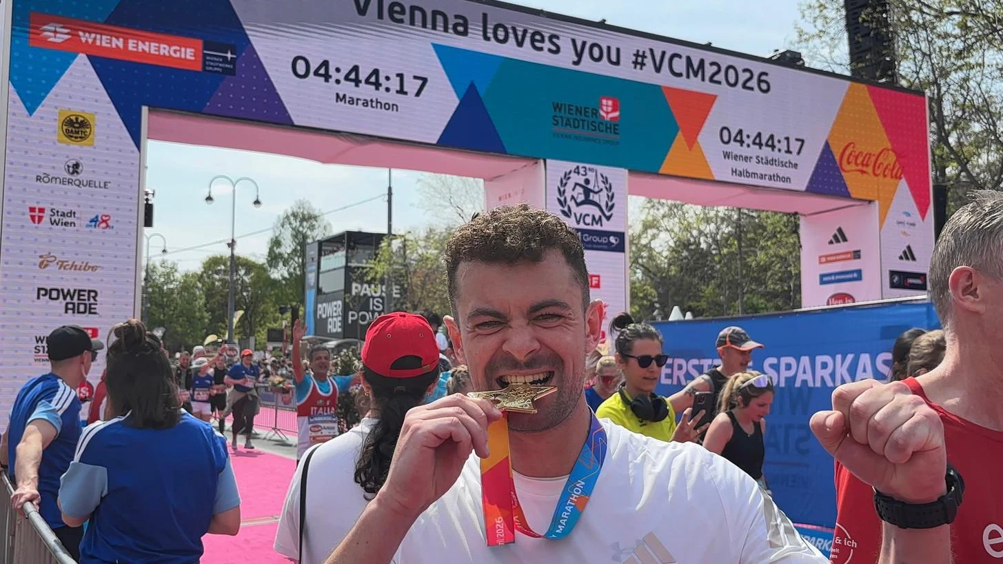 Ö3-Moderator Philipp Bergsmann im Ziel beim Vienna City Marathon.